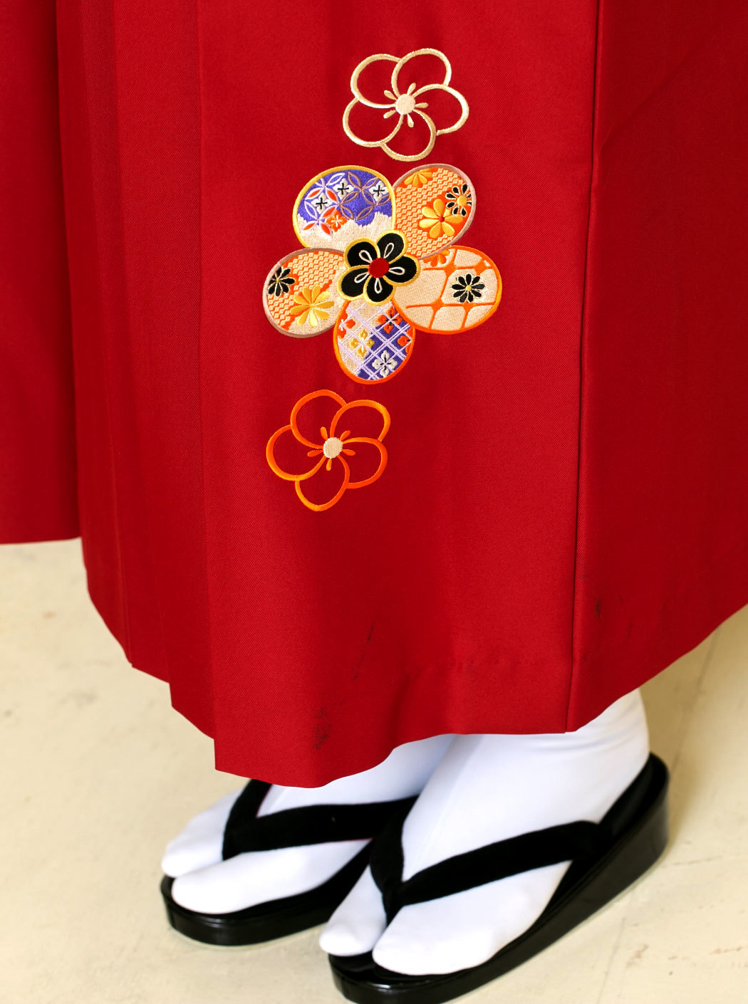 袴は鮮やかな赤に梅の刺繍があしらわれています。