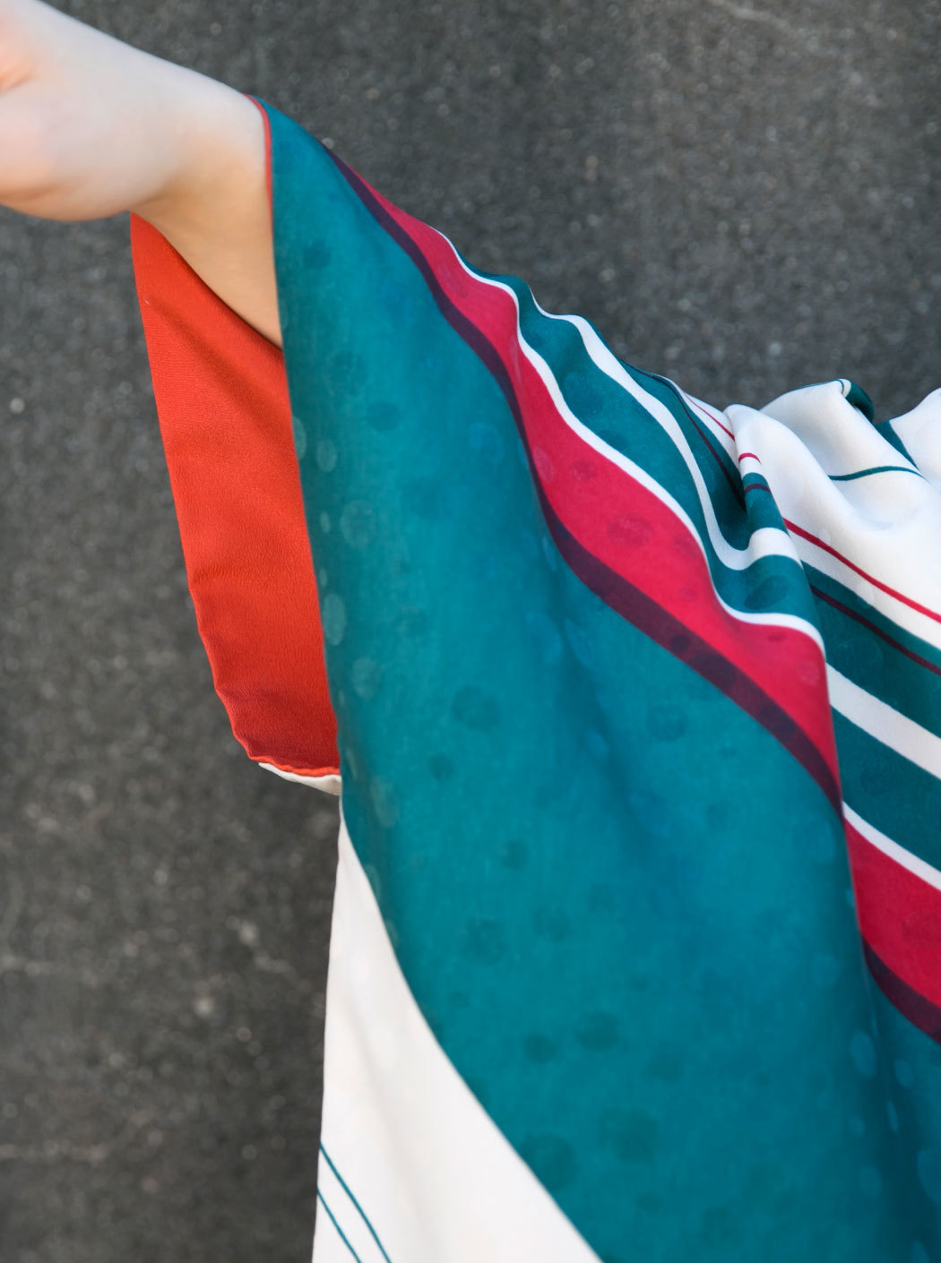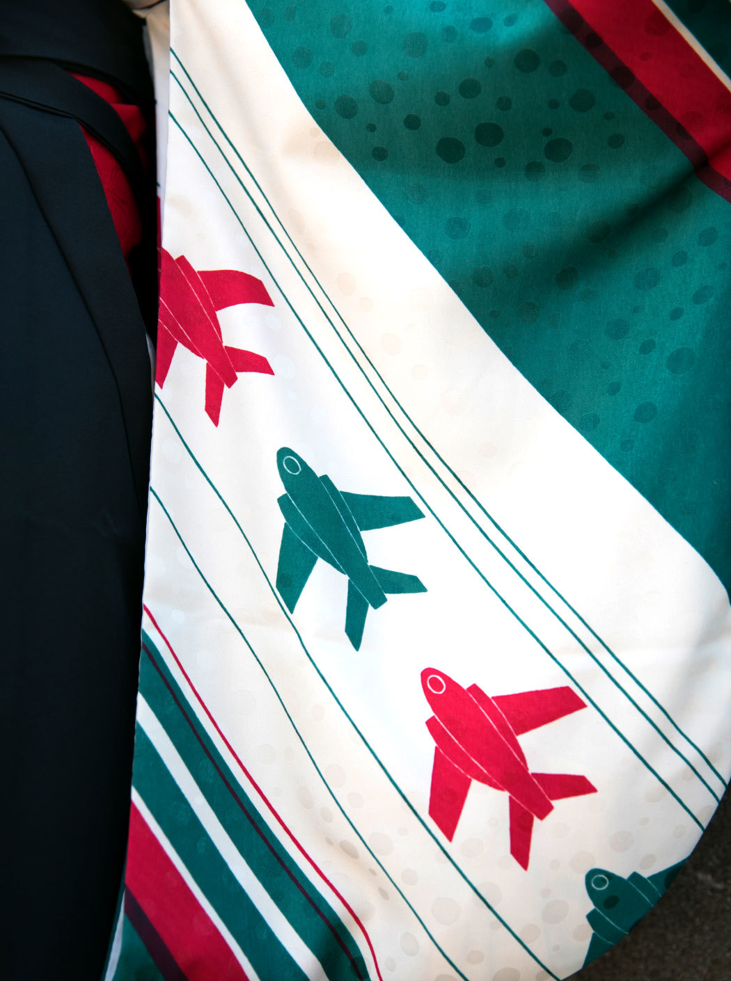 アイコンのような飛行機が飛ぶデザインの着物です。