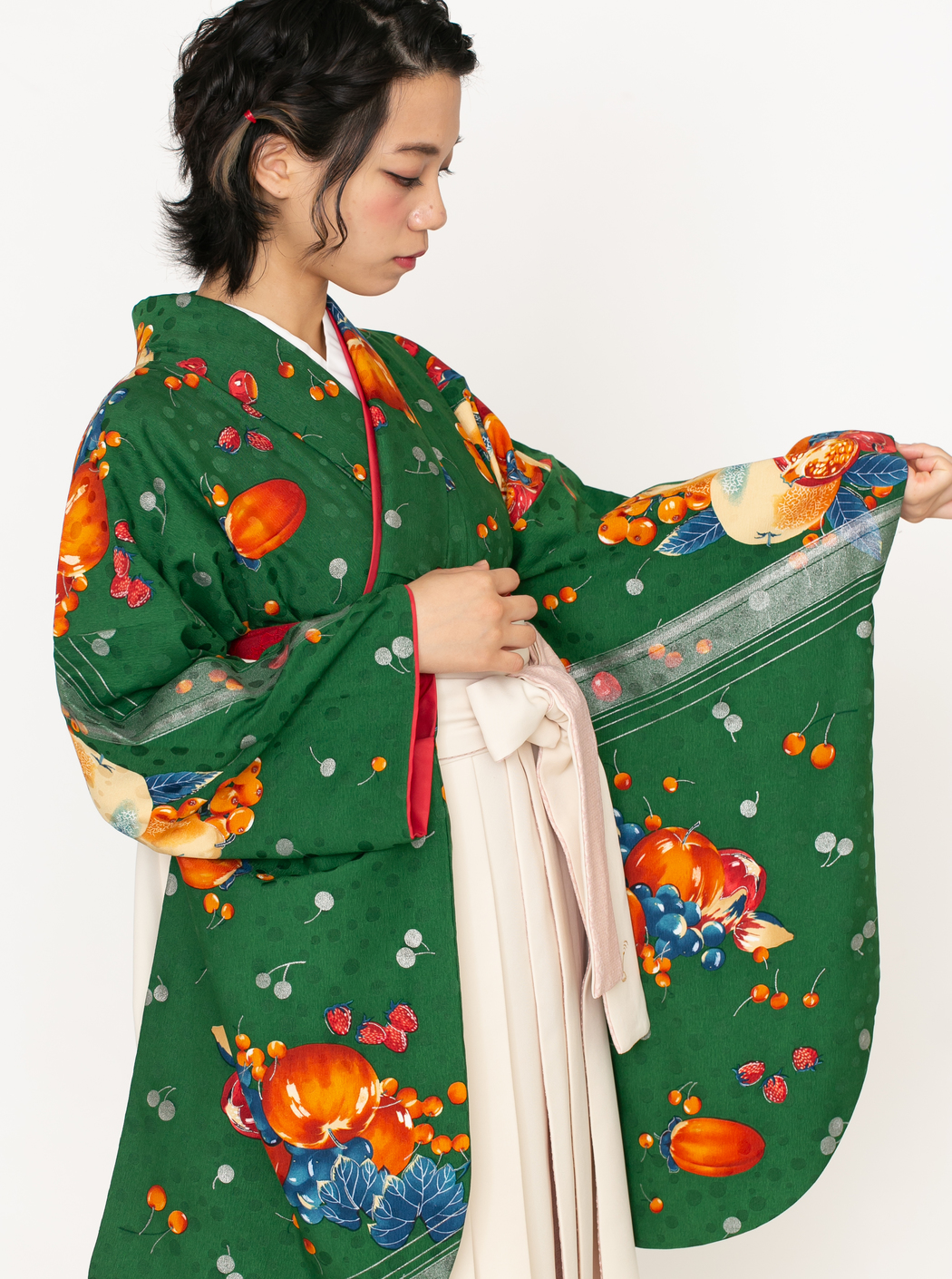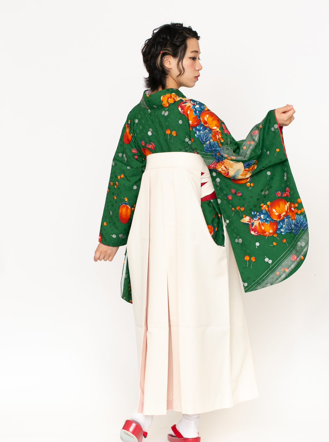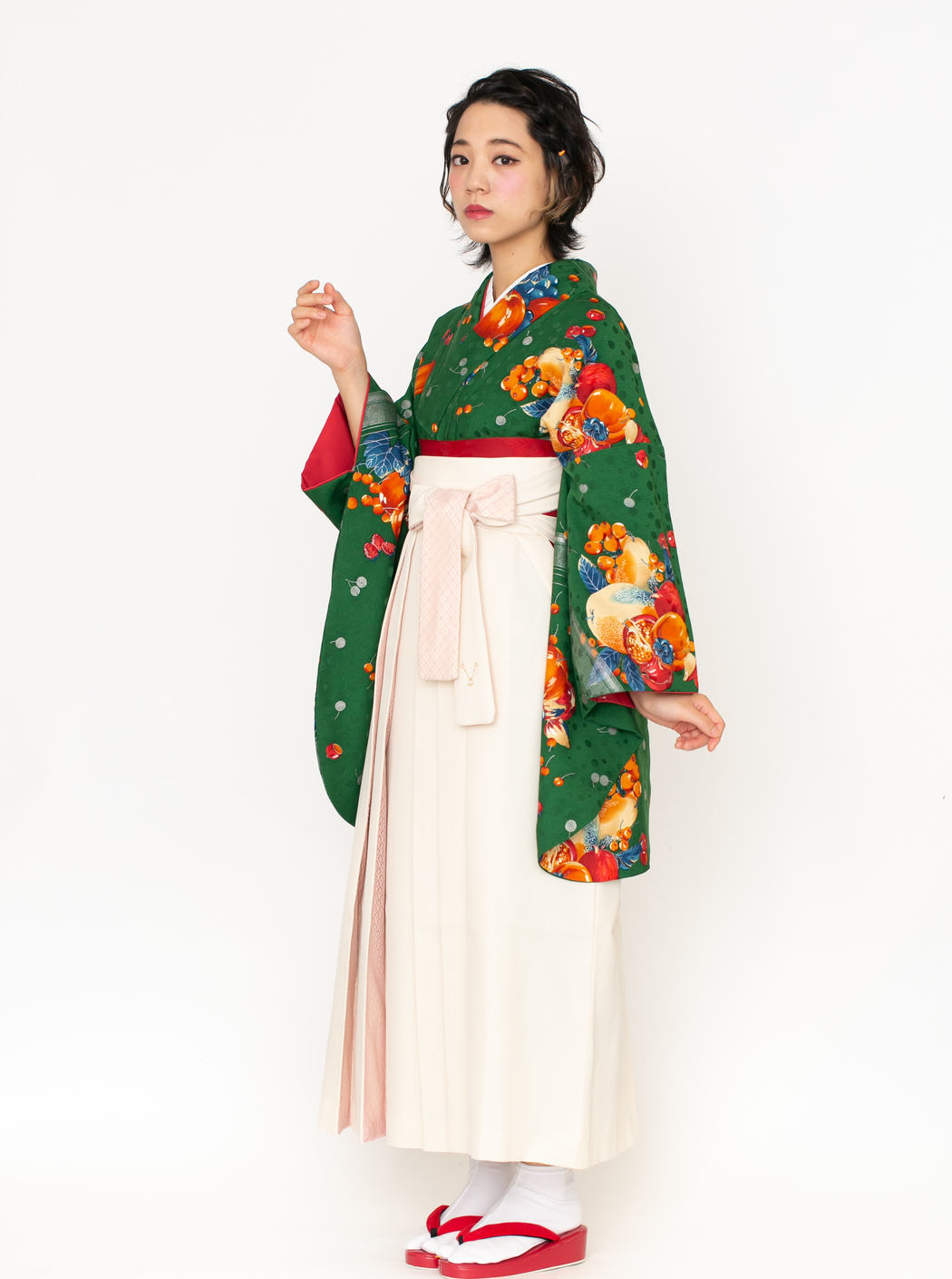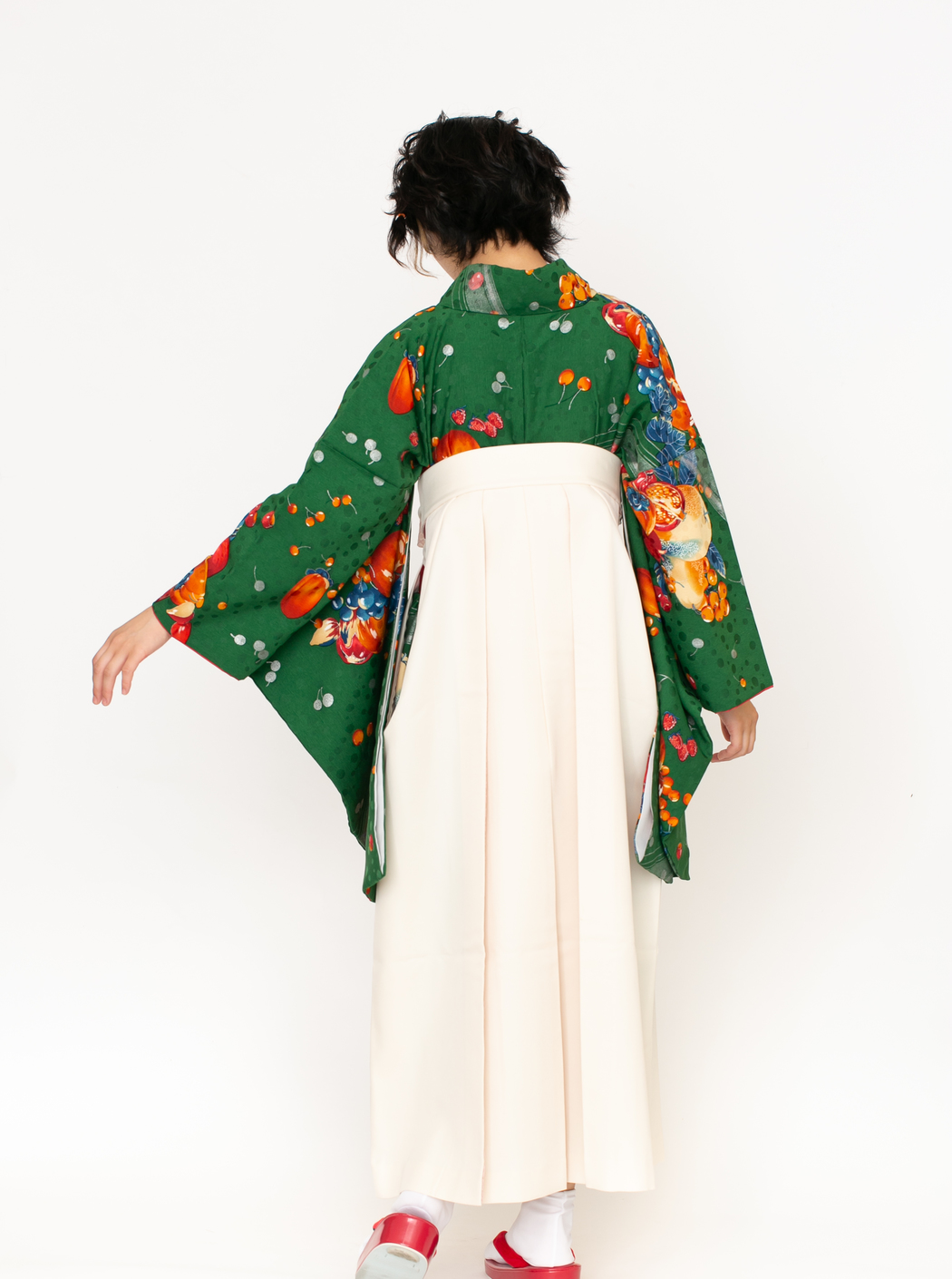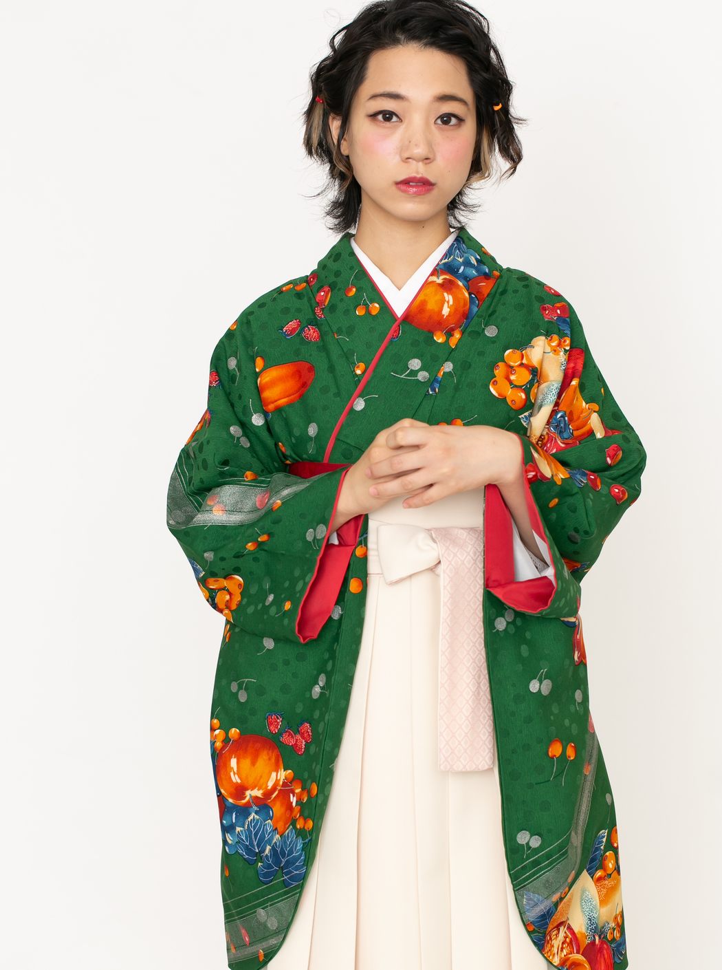 fullfullフルーツ/緑(袴:アコーディオン/白×ピンクレース)