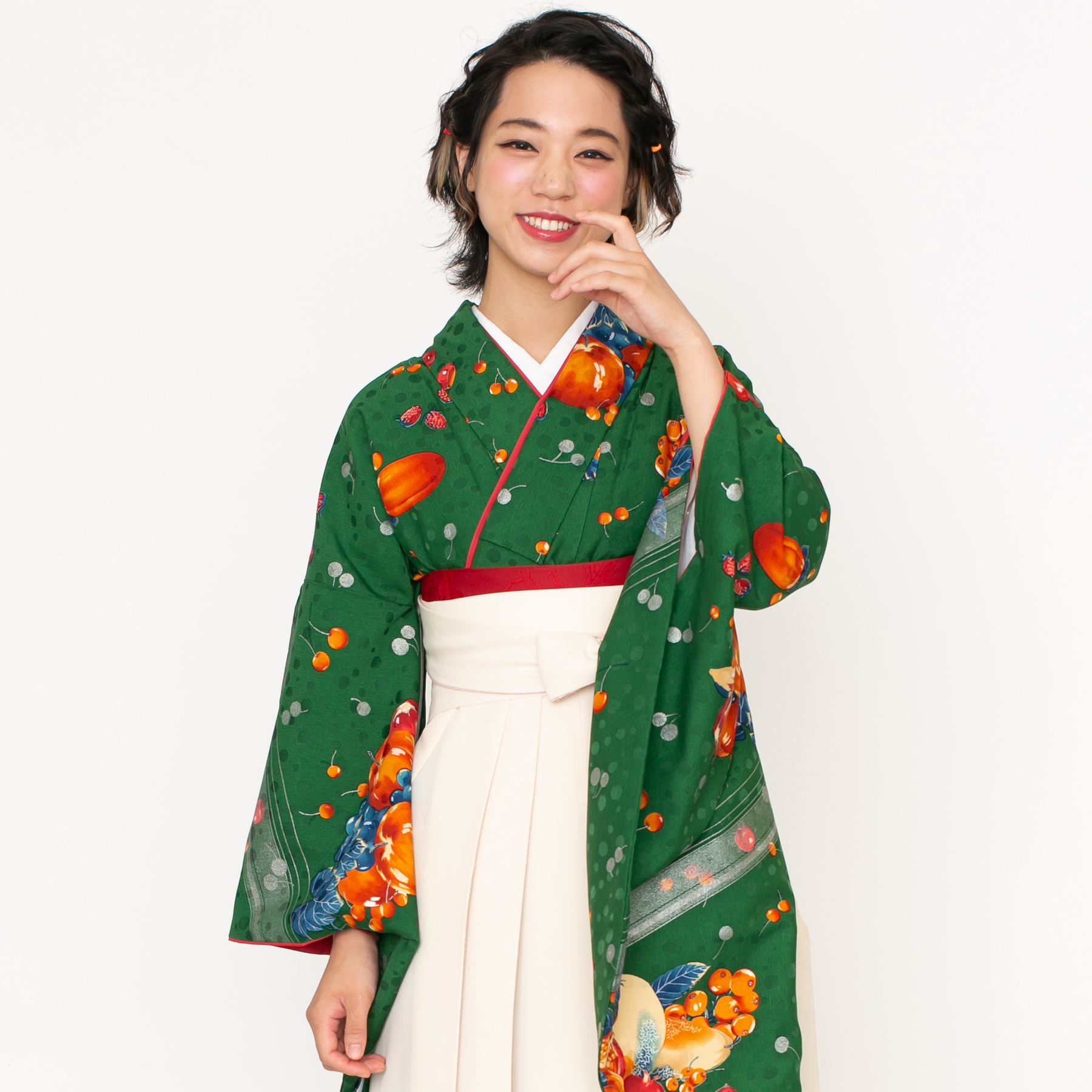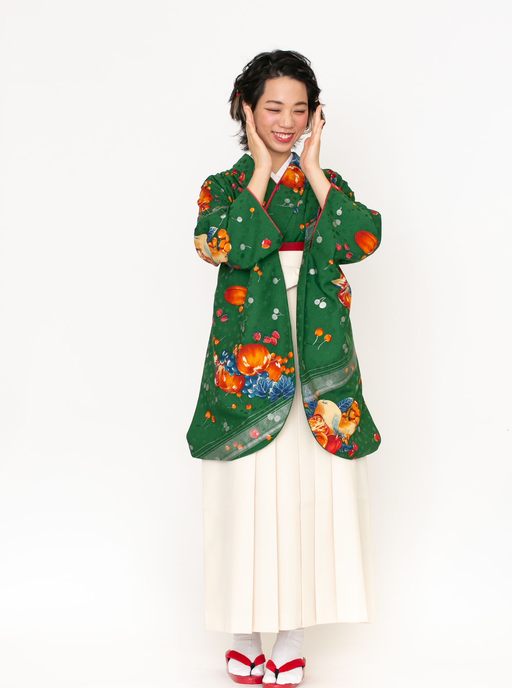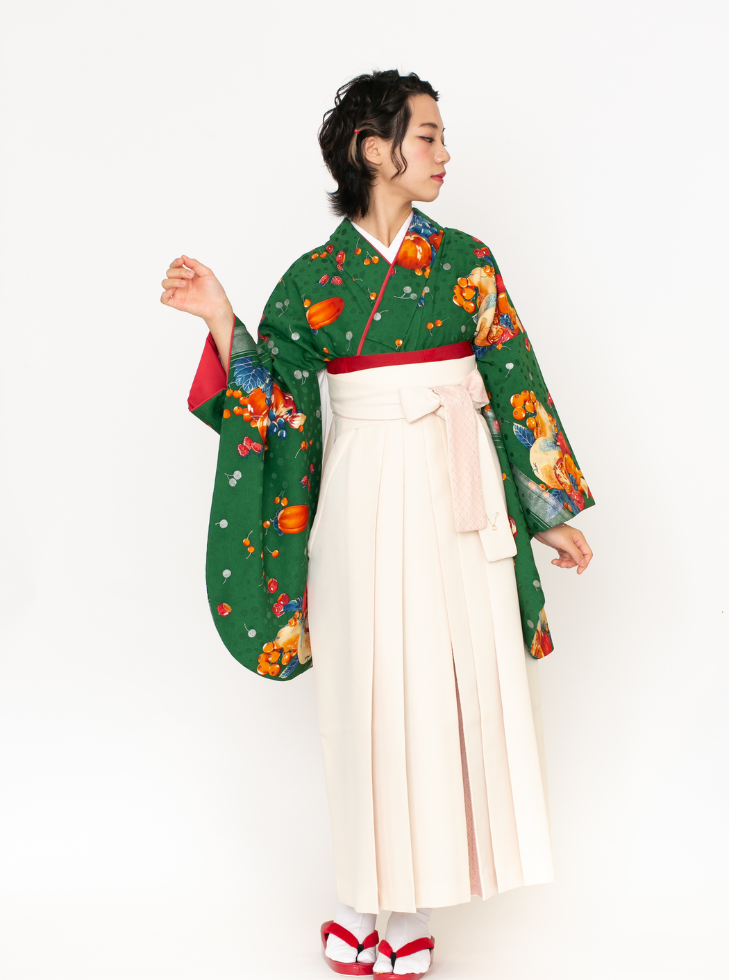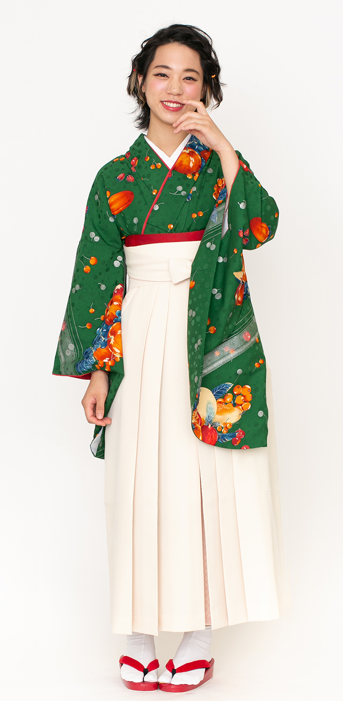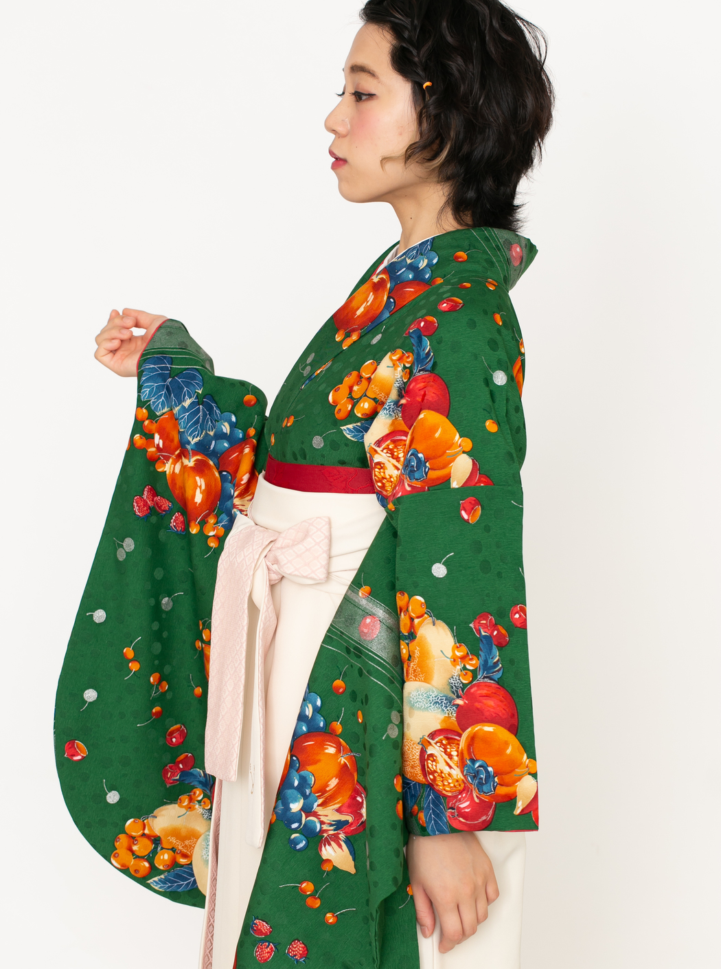 fullfullフルーツ/緑(袴:アコーディオン/白×ピンクレース)