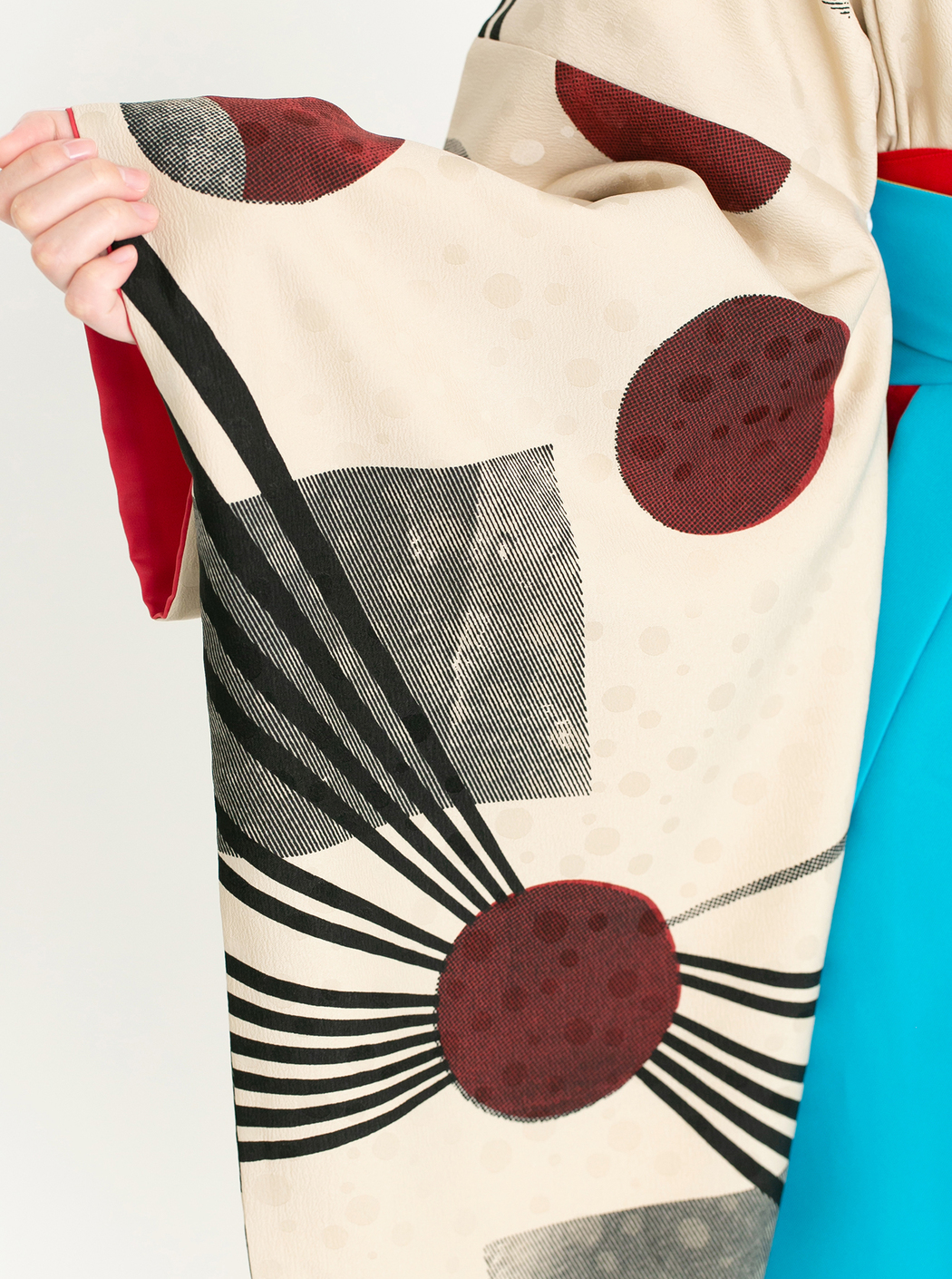 「再生」というテーマでモダンアンテナがデザインした二尺袖の着物です。繰り返す宇宙や生命をイメージしたポップでアーティスティックな柄です。