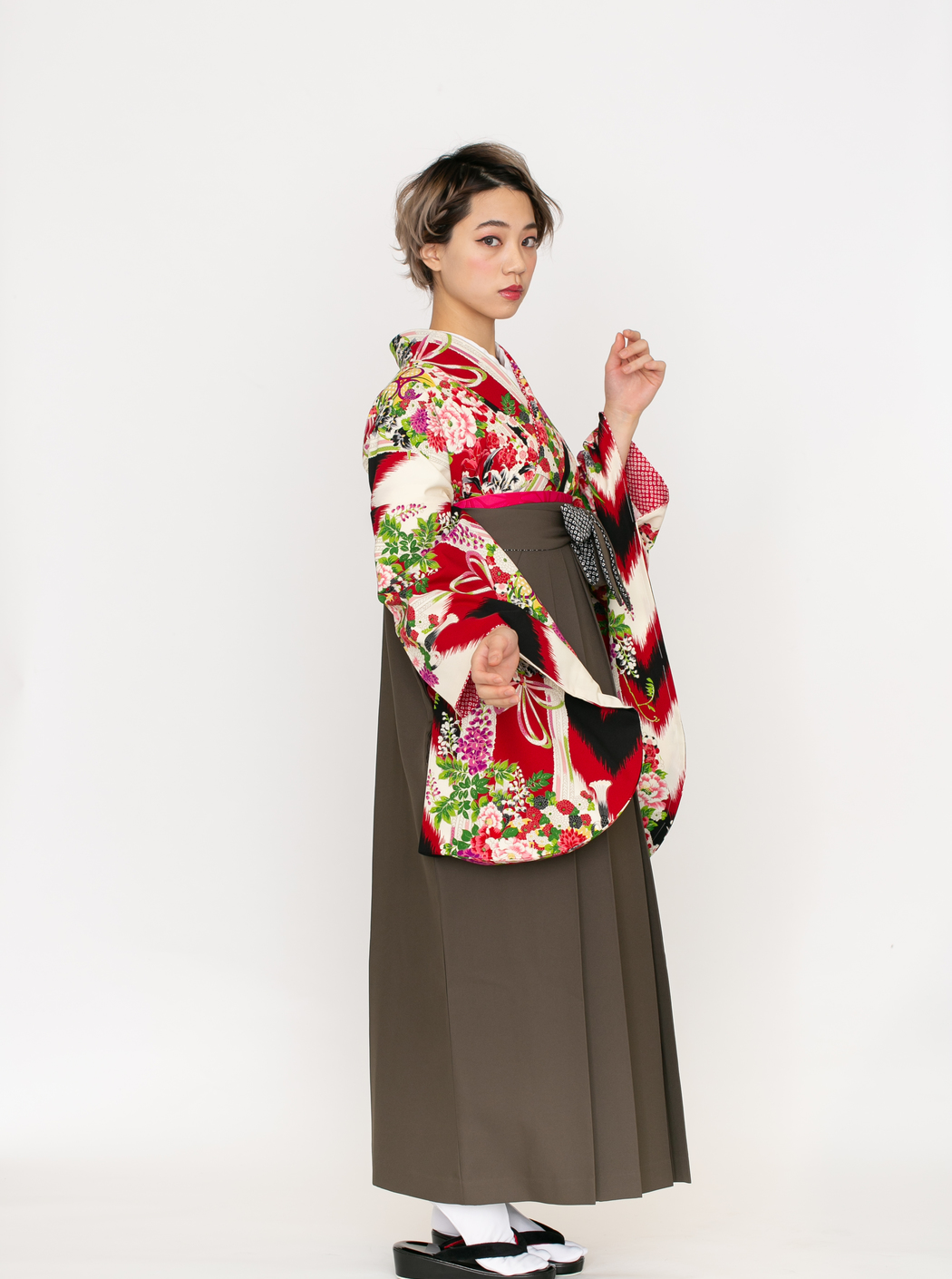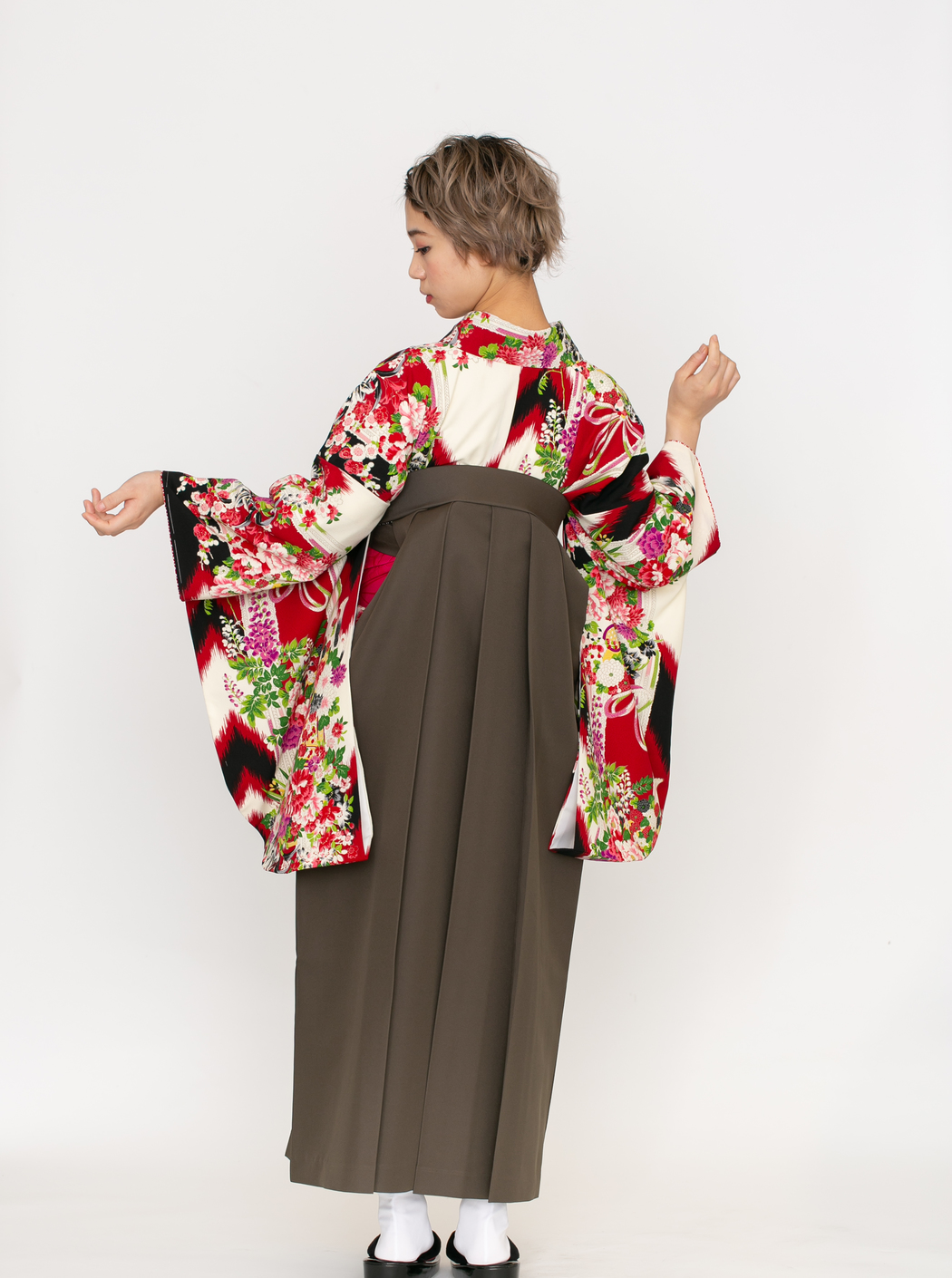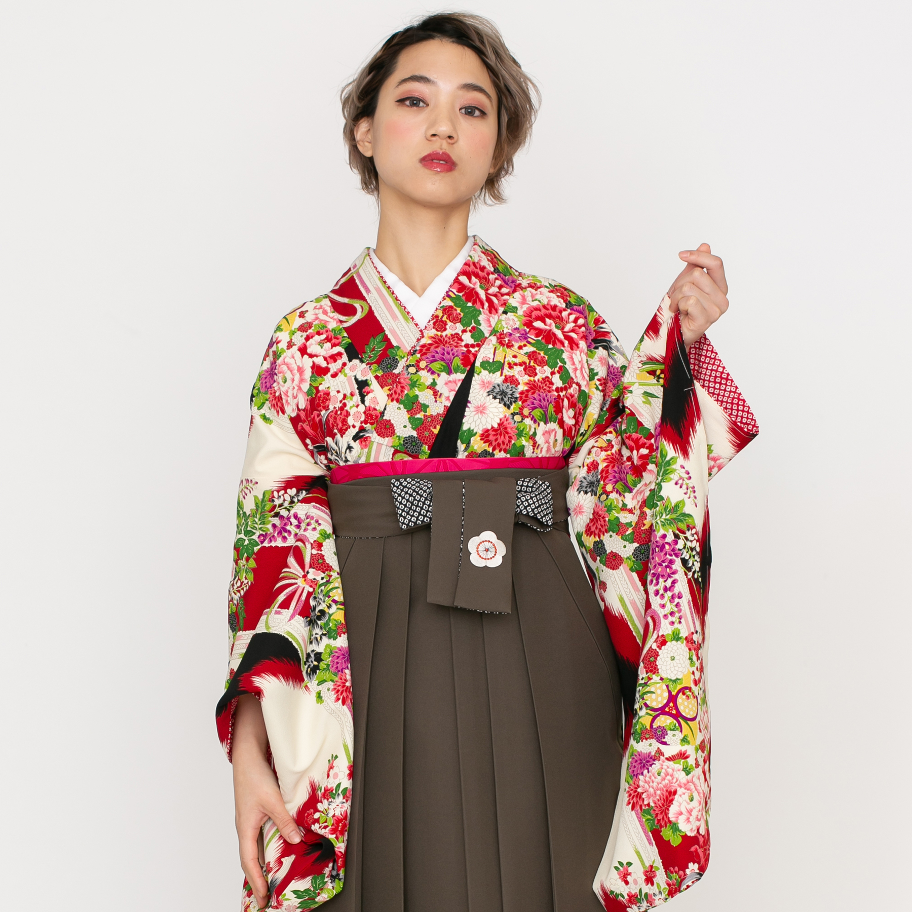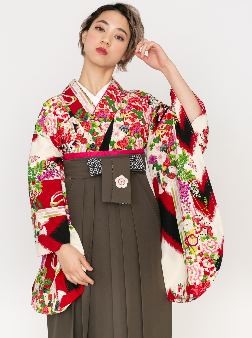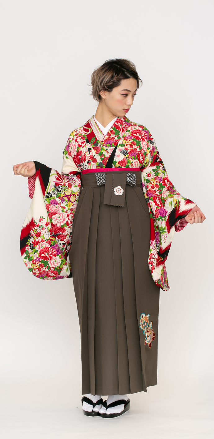 黒と赤の矢絣に、牡丹・小さな菊や梅がブーケのように描かれています。