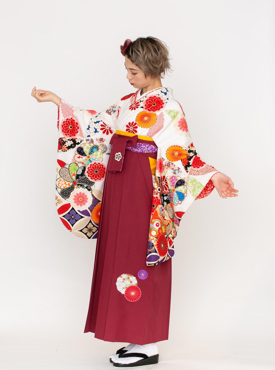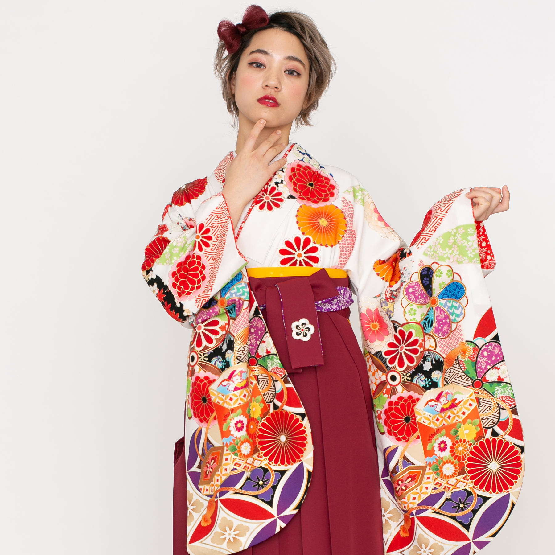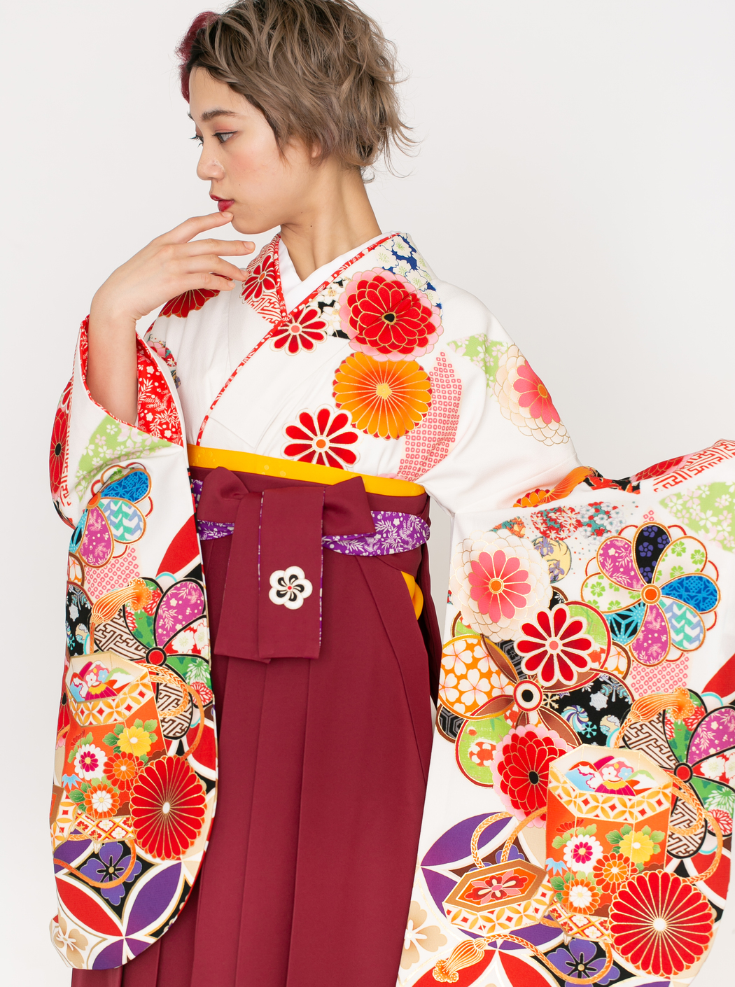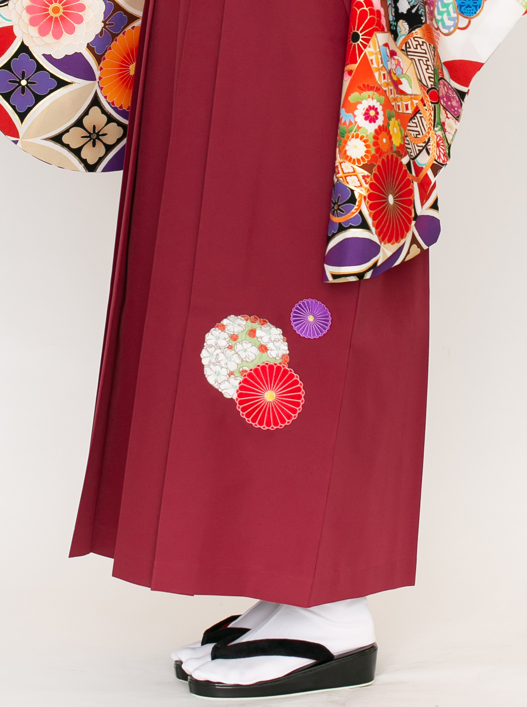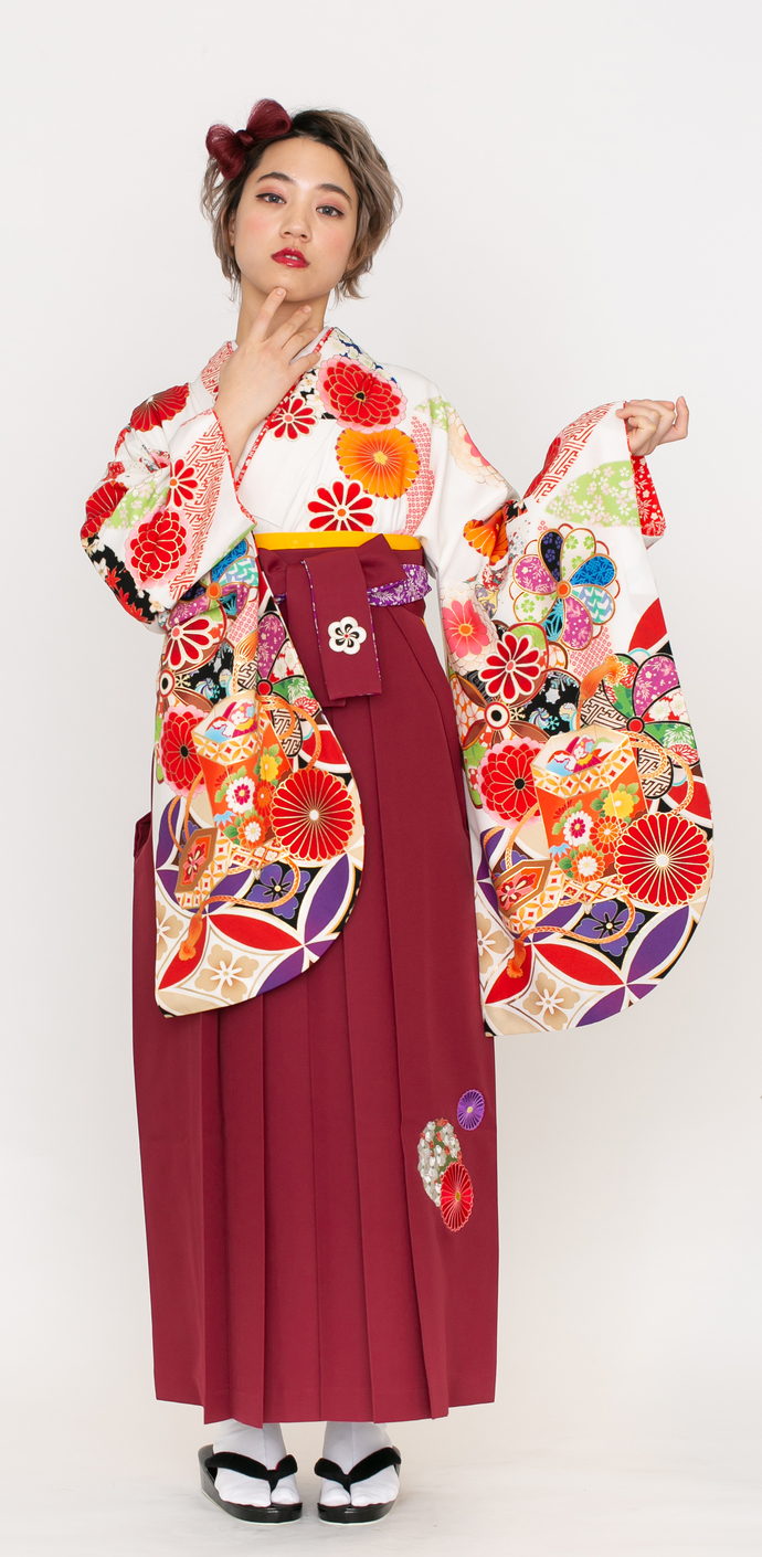 七宝に貝桶/白【榛原】(袴:菊に梅刺繍/エンジ)