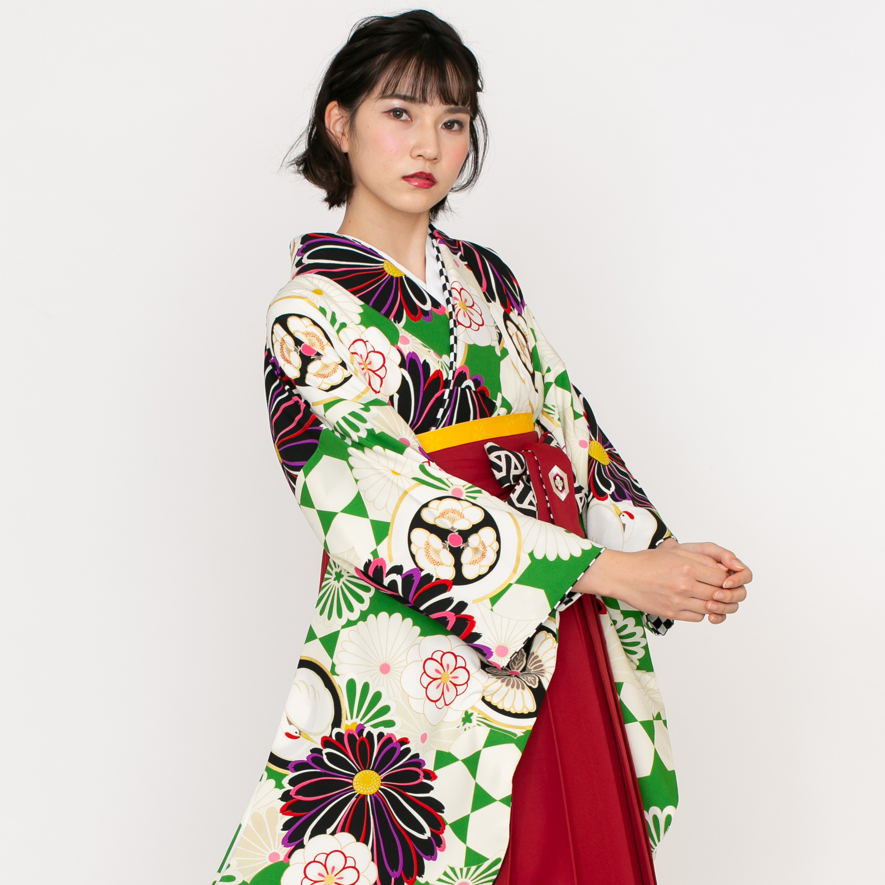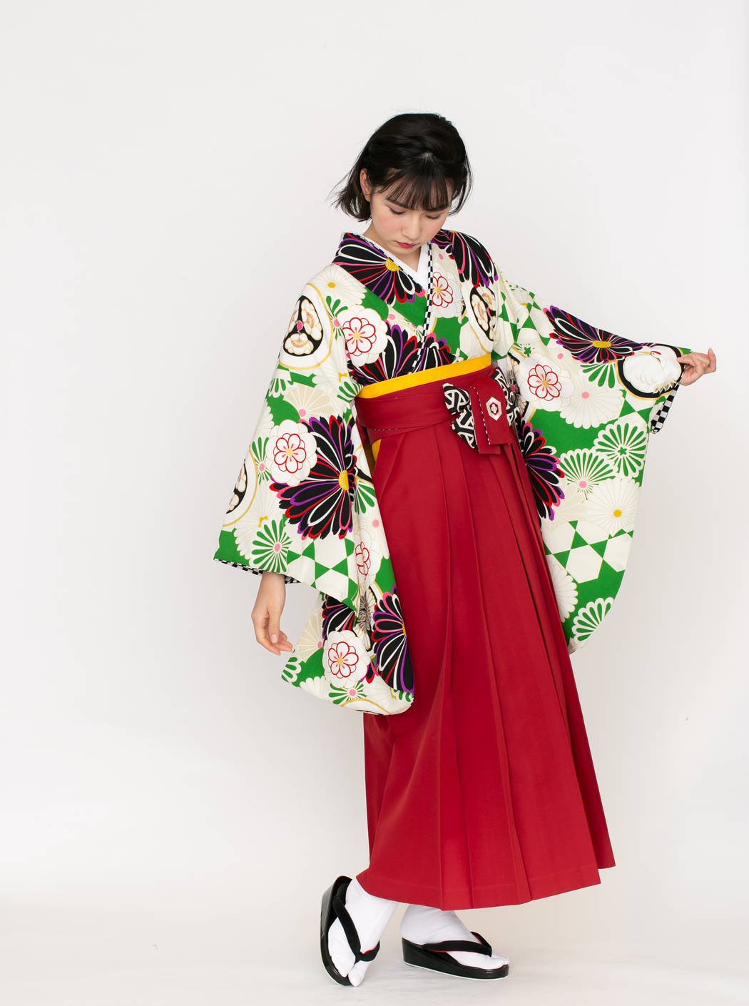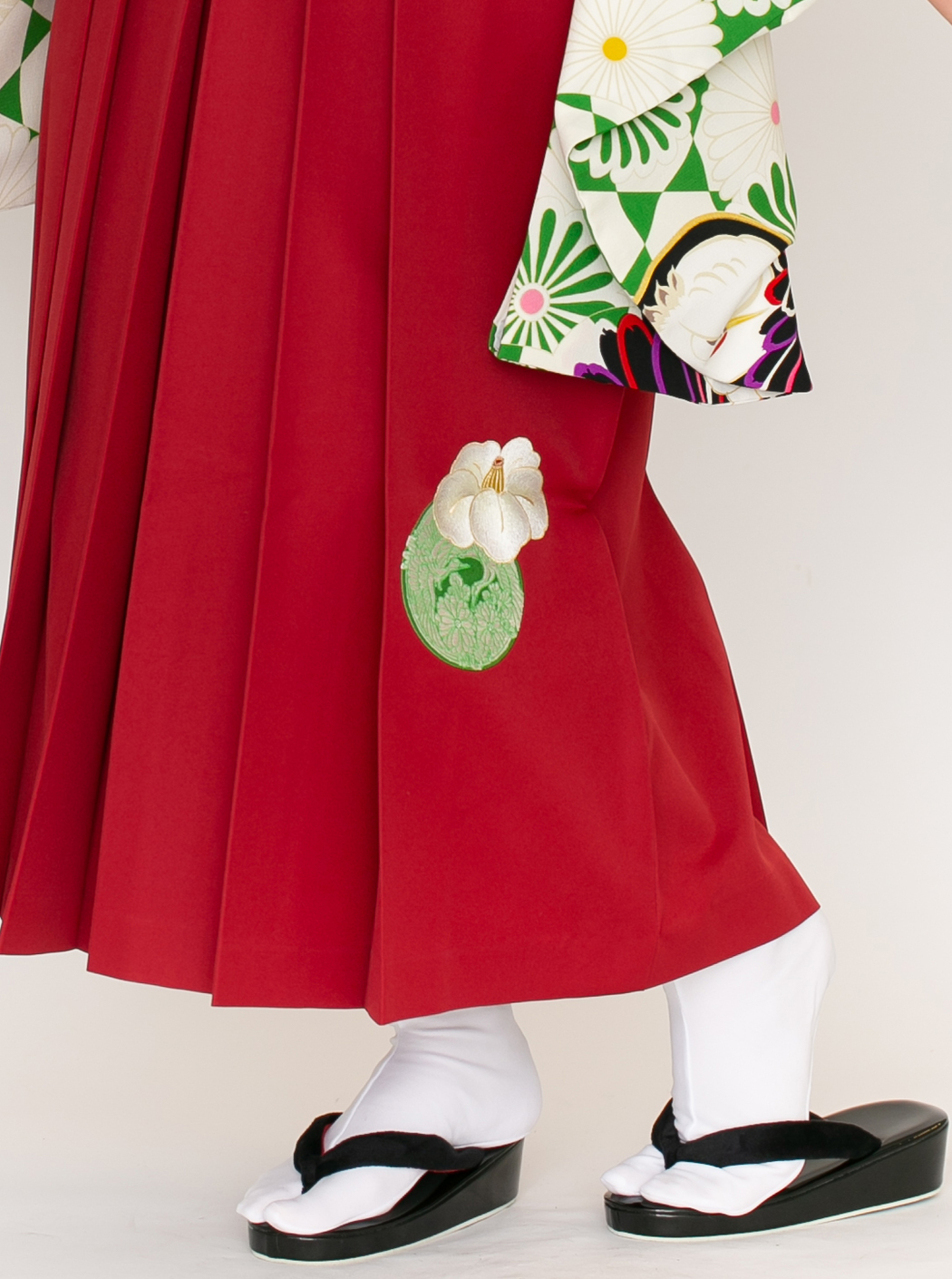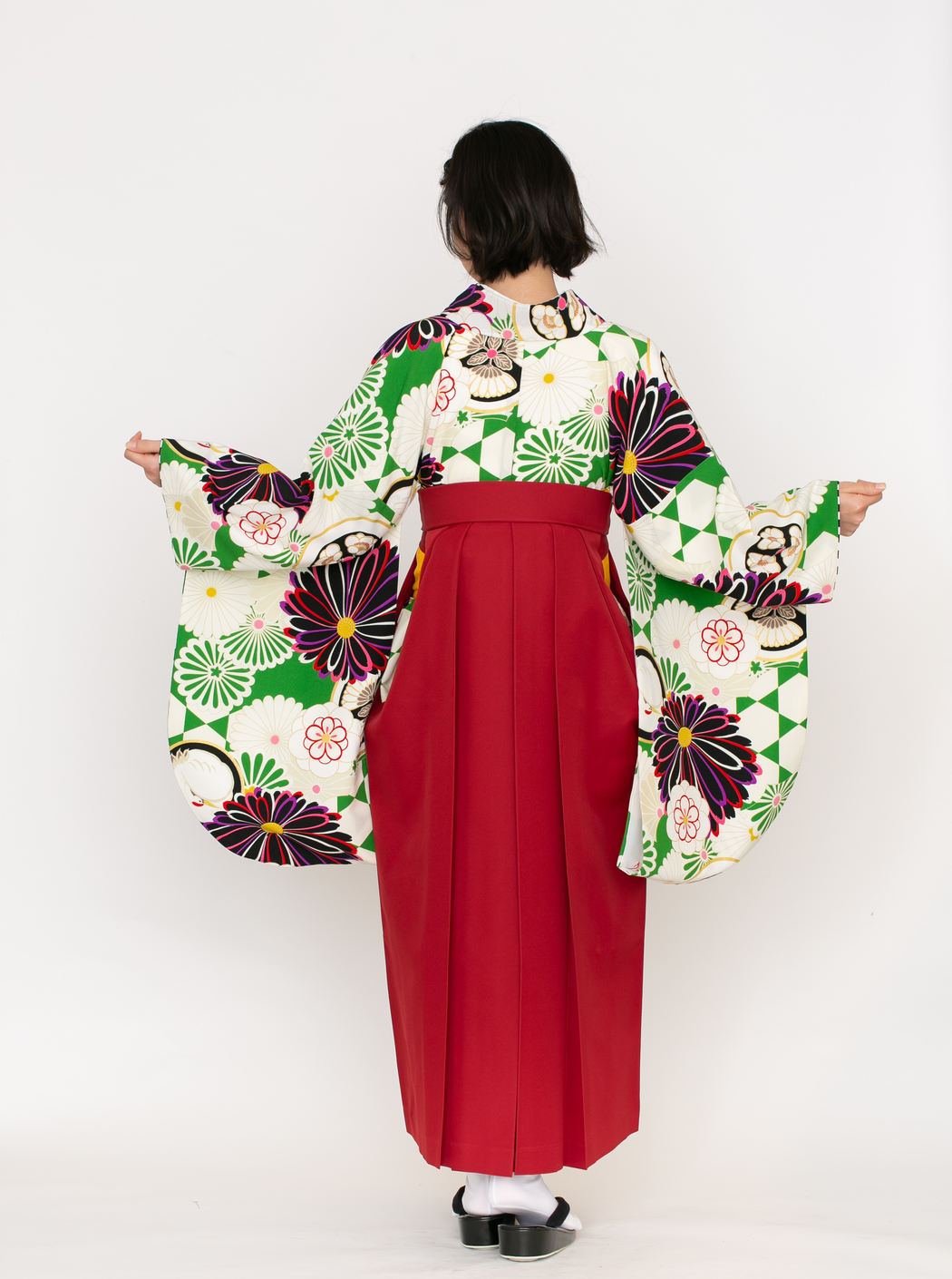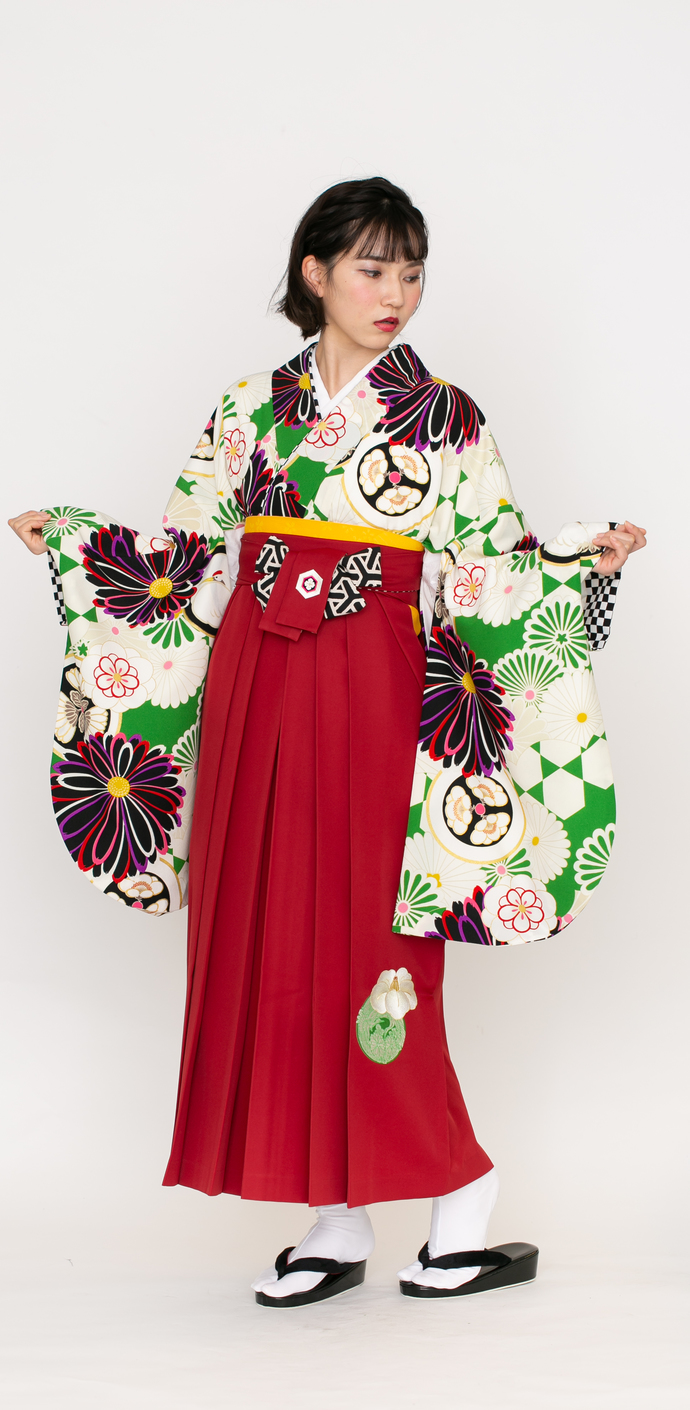 菊に紋/黄緑【JAPAN STYLE】(袴:椿に丸紋刺繍/エンジ)