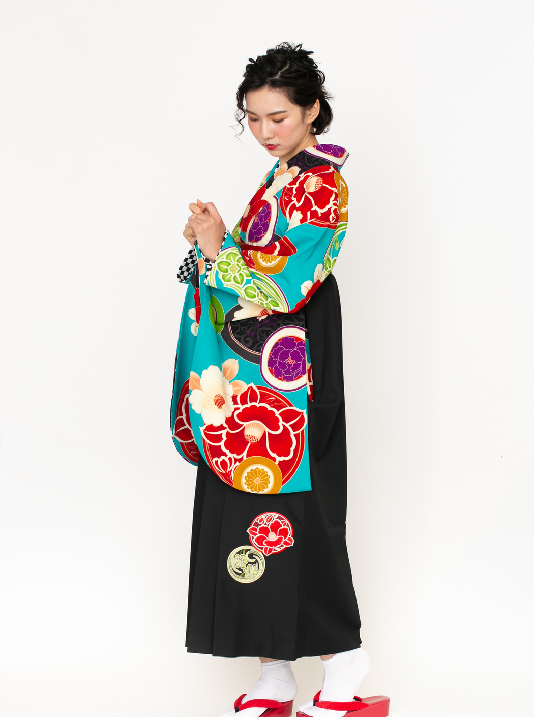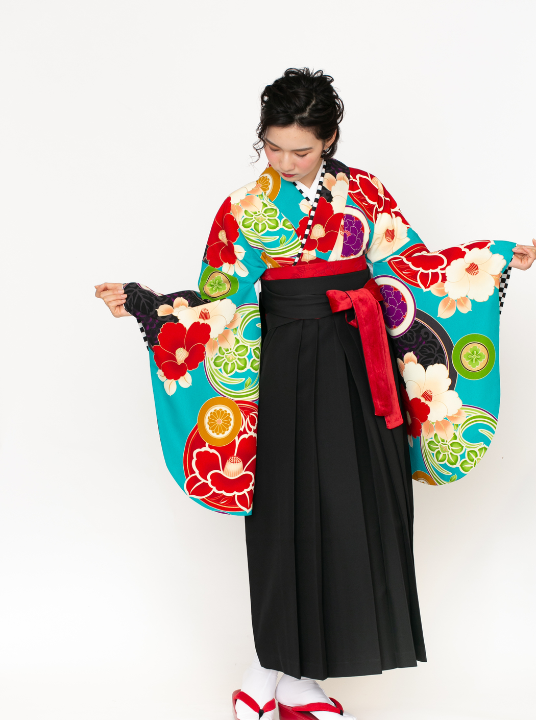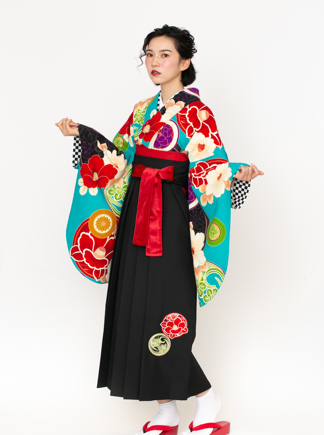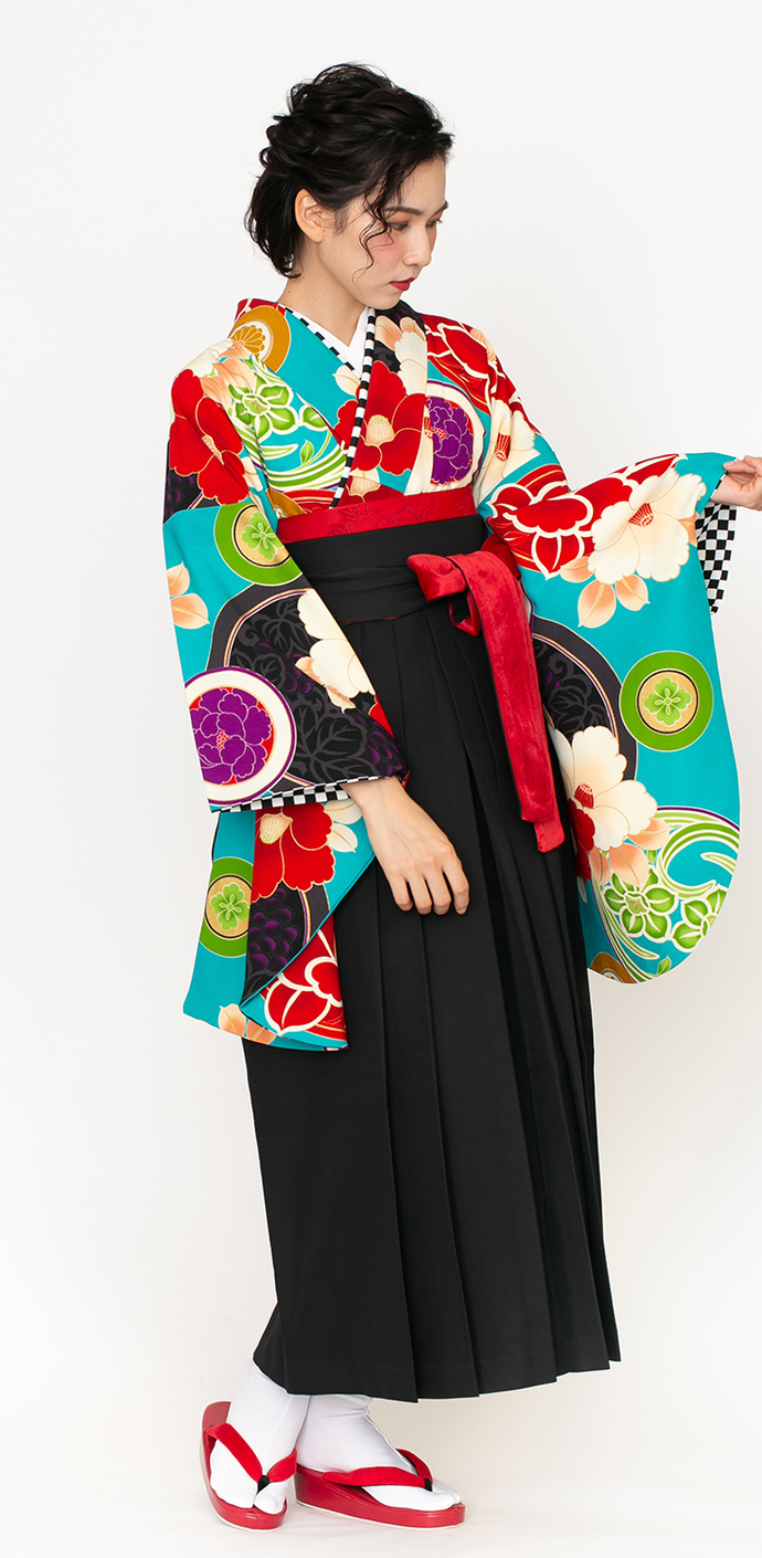 椿に丸紋/ターコイズ【JAPAN STYLE×中村里砂】(袴:椿丸紋刺繍/黒)