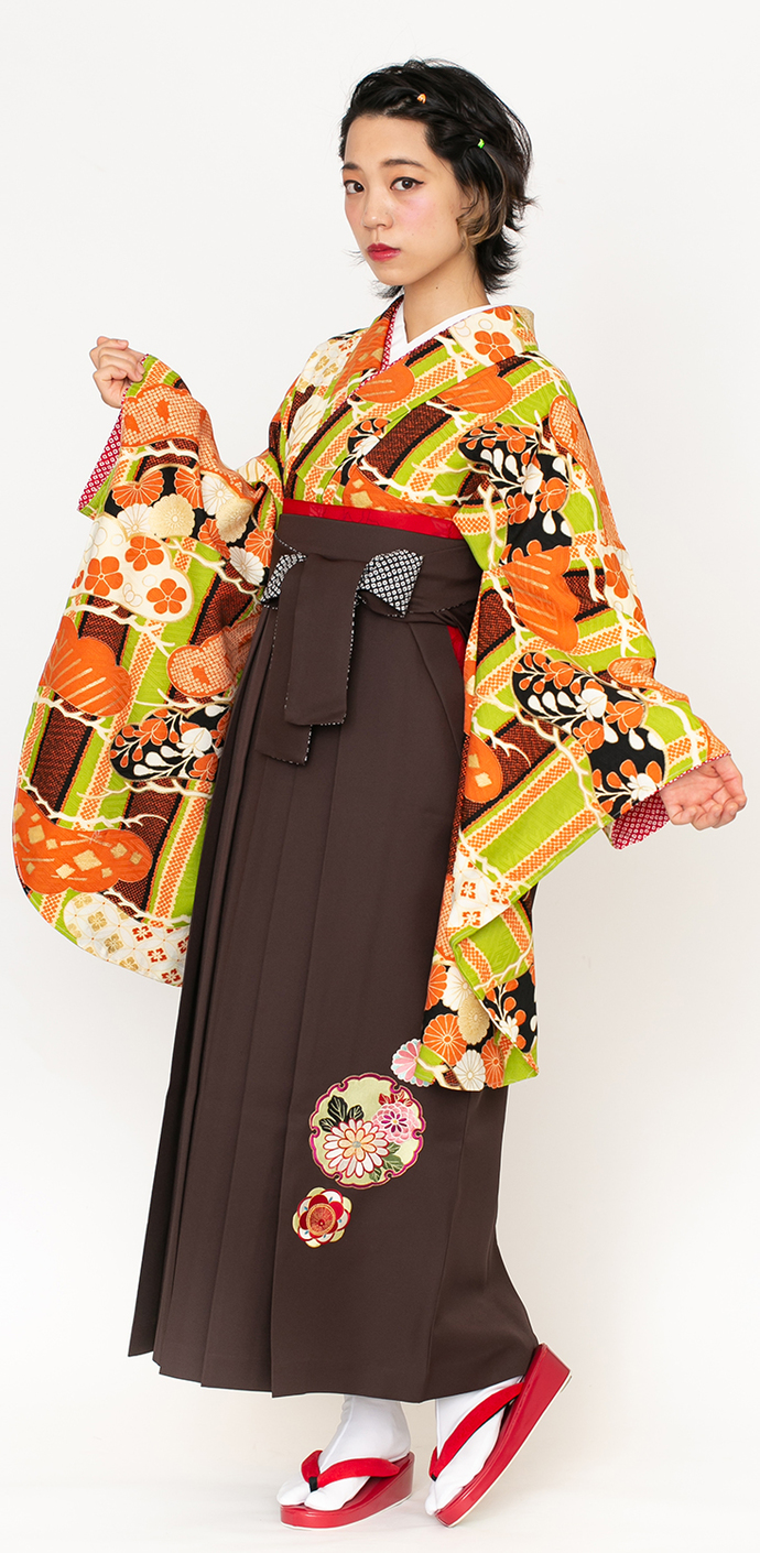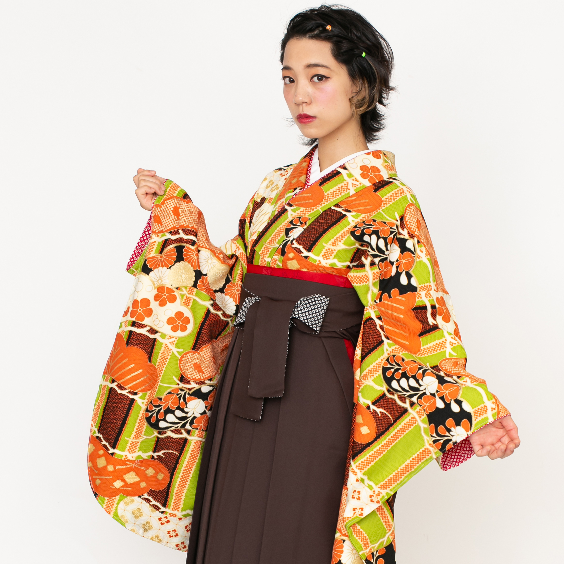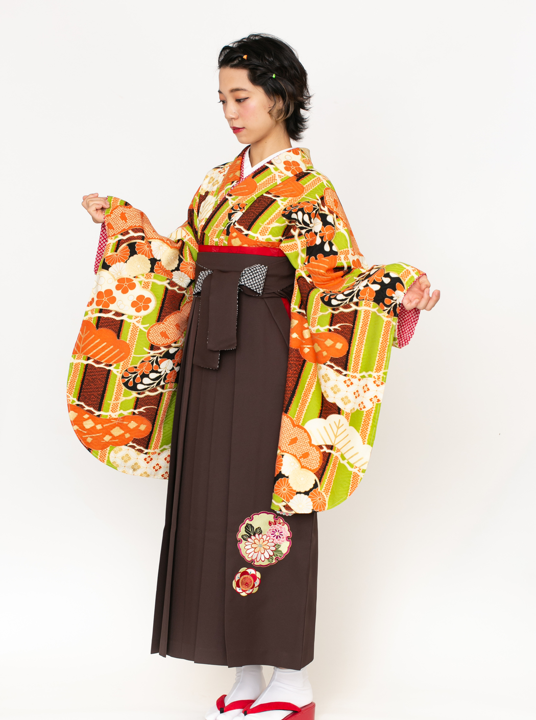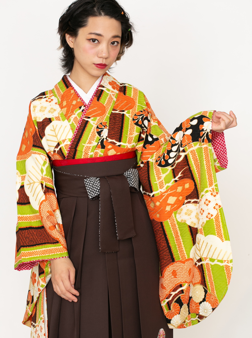 松に縞/黄緑【九重】(袴:雪輪刺繍/焦茶)