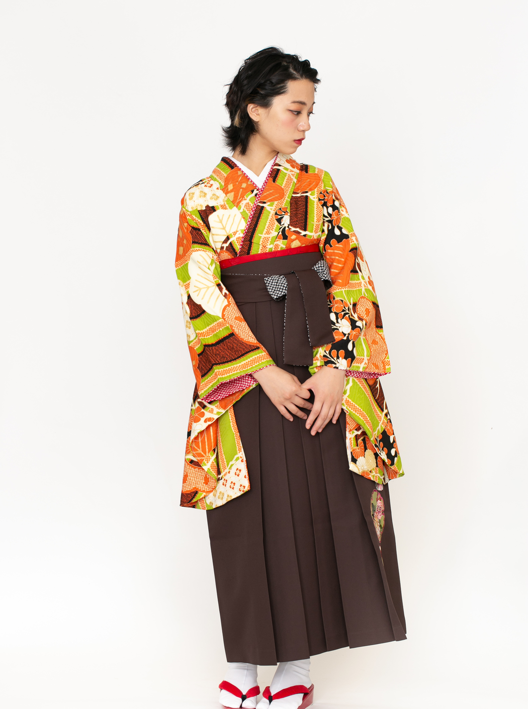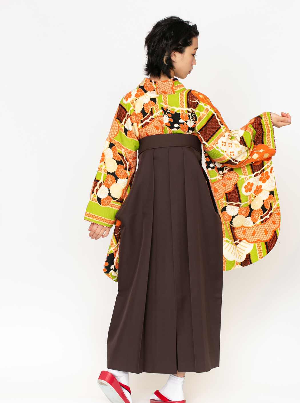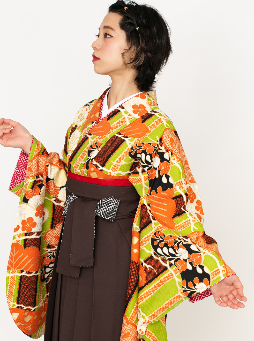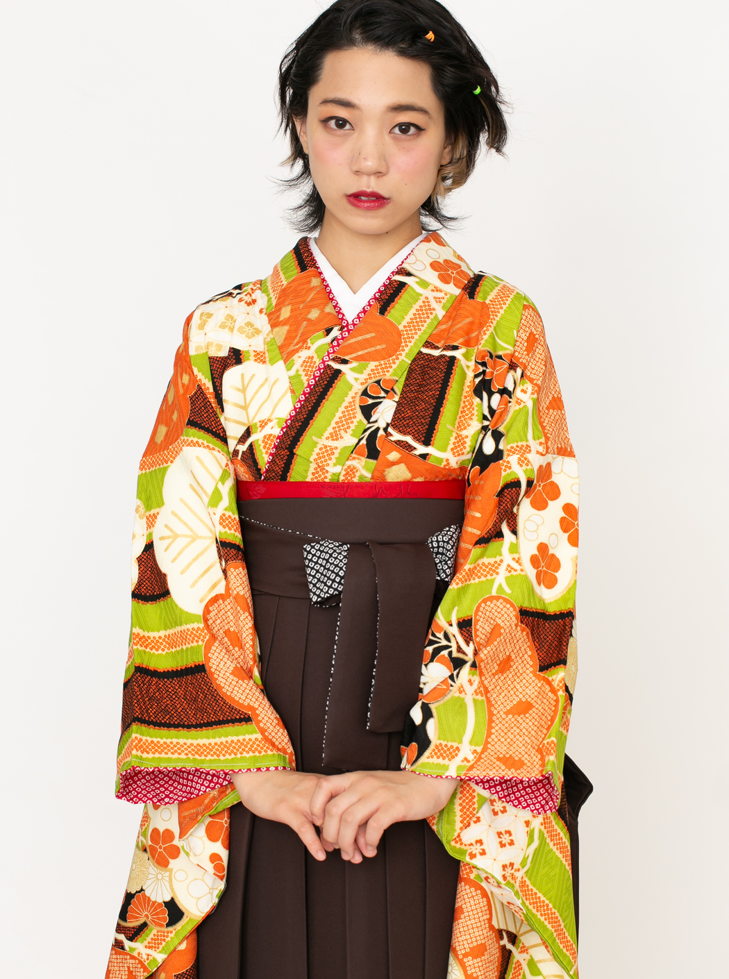 松に縞/黄緑【九重】(袴:雪輪刺繍/焦茶)