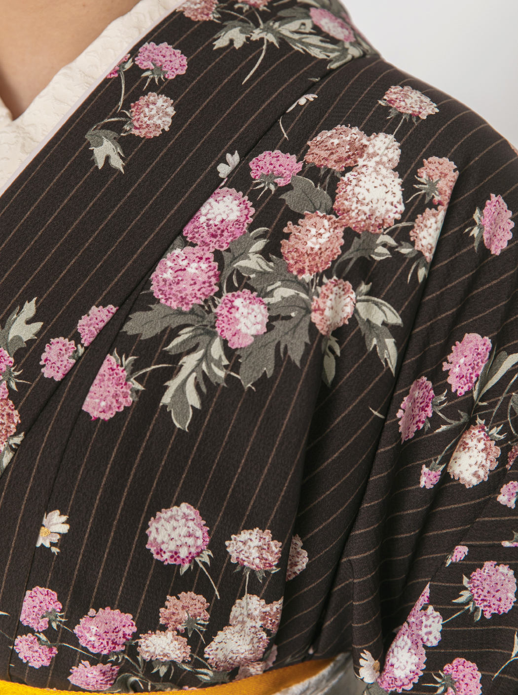 ストライプ地にピンクの小花が描かれた二尺袖。地色は焦げ茶。