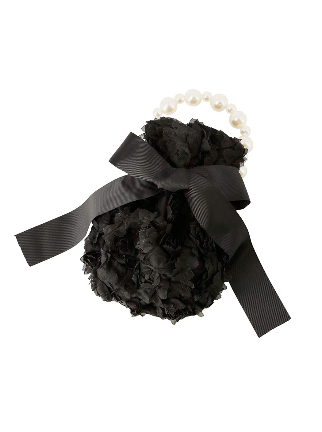 巾着は黒いレースに大きなリボン。持ち手はパール調になっています。
