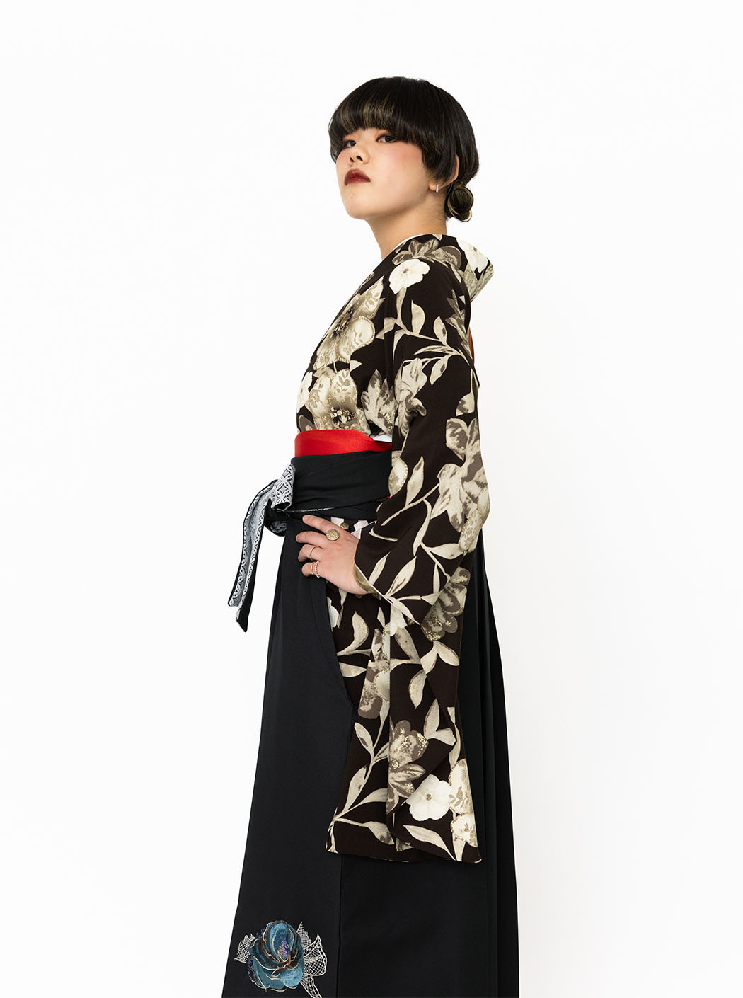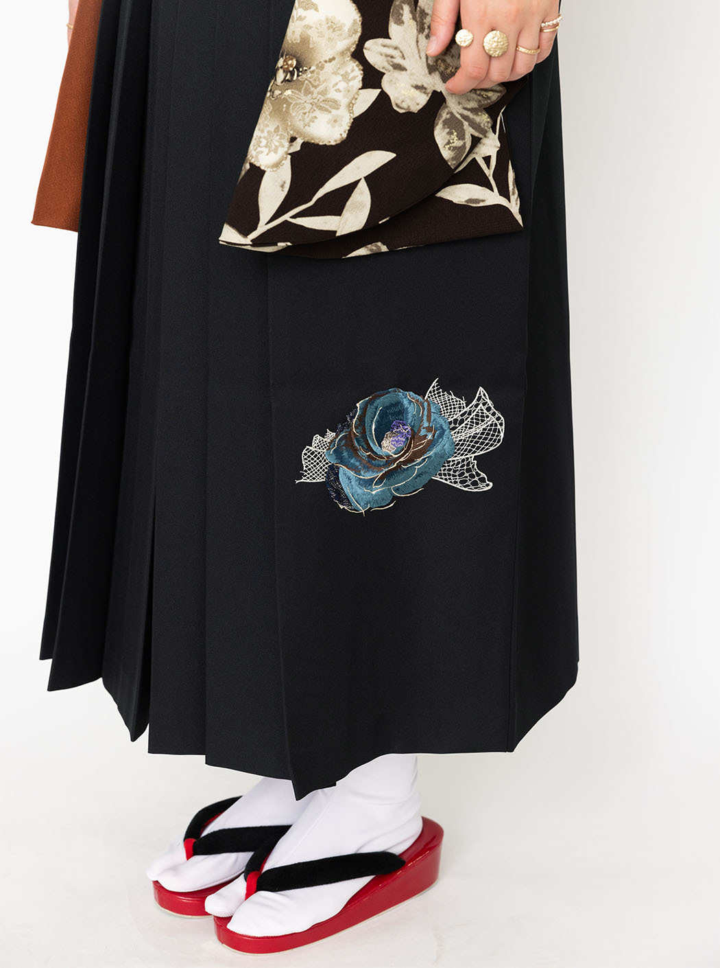 袴は黒地にバラの刺繡が施されています。
