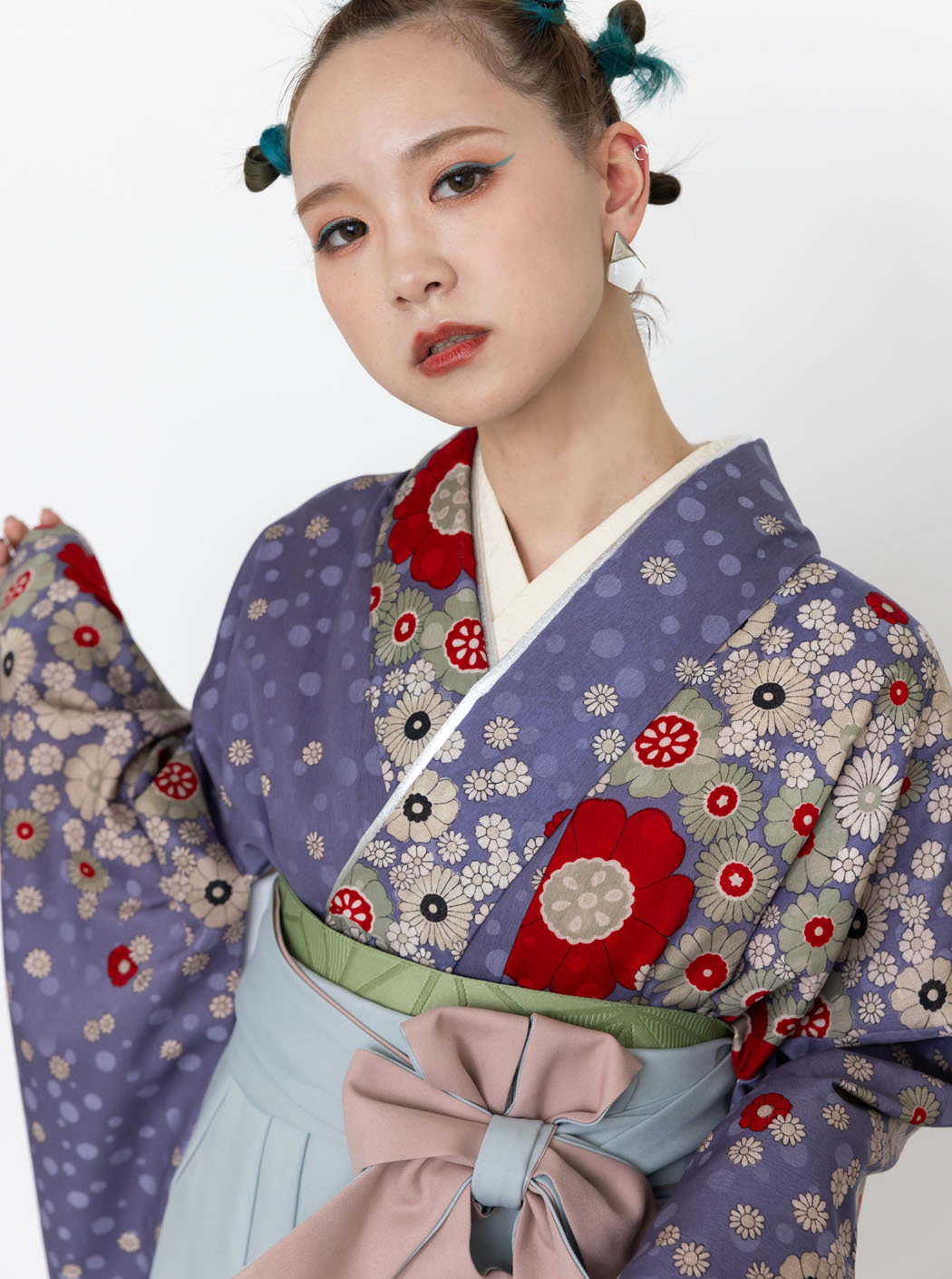モダンアンテナが二尺袖に合わせて袴、重ね衿、袴下(半幅帯)、巾着、草履をコーディネートした、特別なレンタル商品をご用意しました。