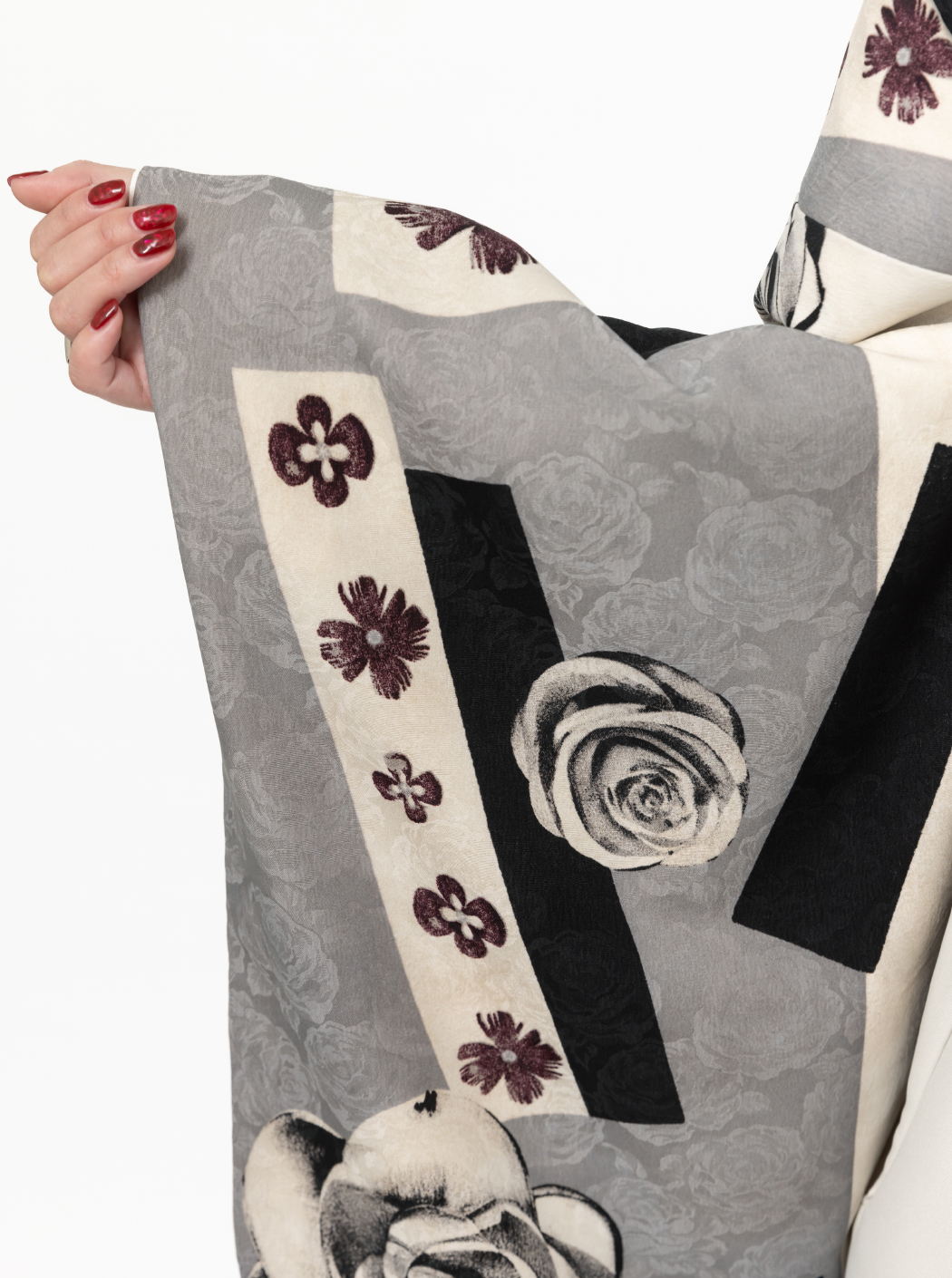 大きなモノクロのバラと小さな花たちが幾何学模様の中にデザインされた柄。
