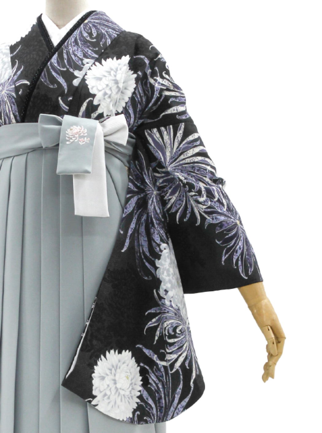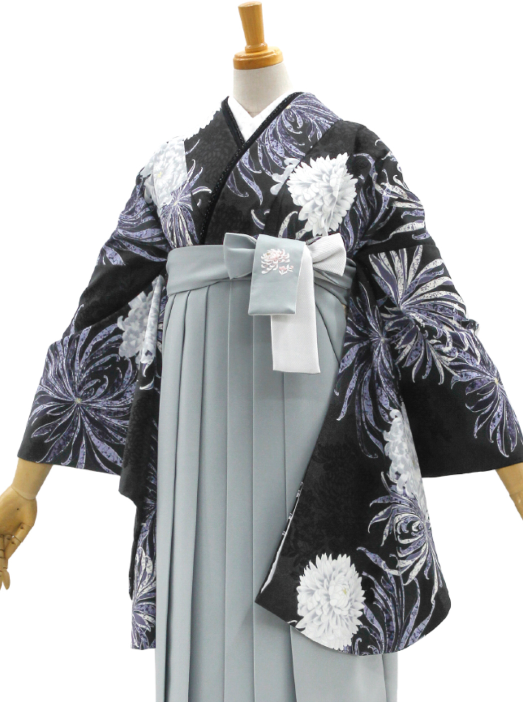 袴はスモークブルーの地色に乱菊の刺繡が施されています。