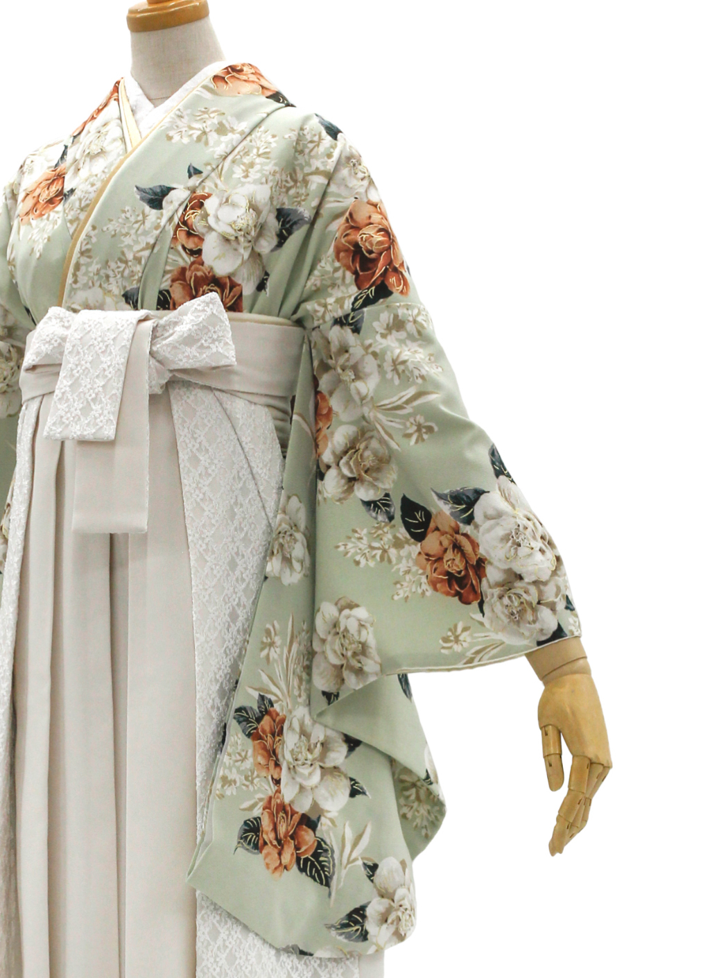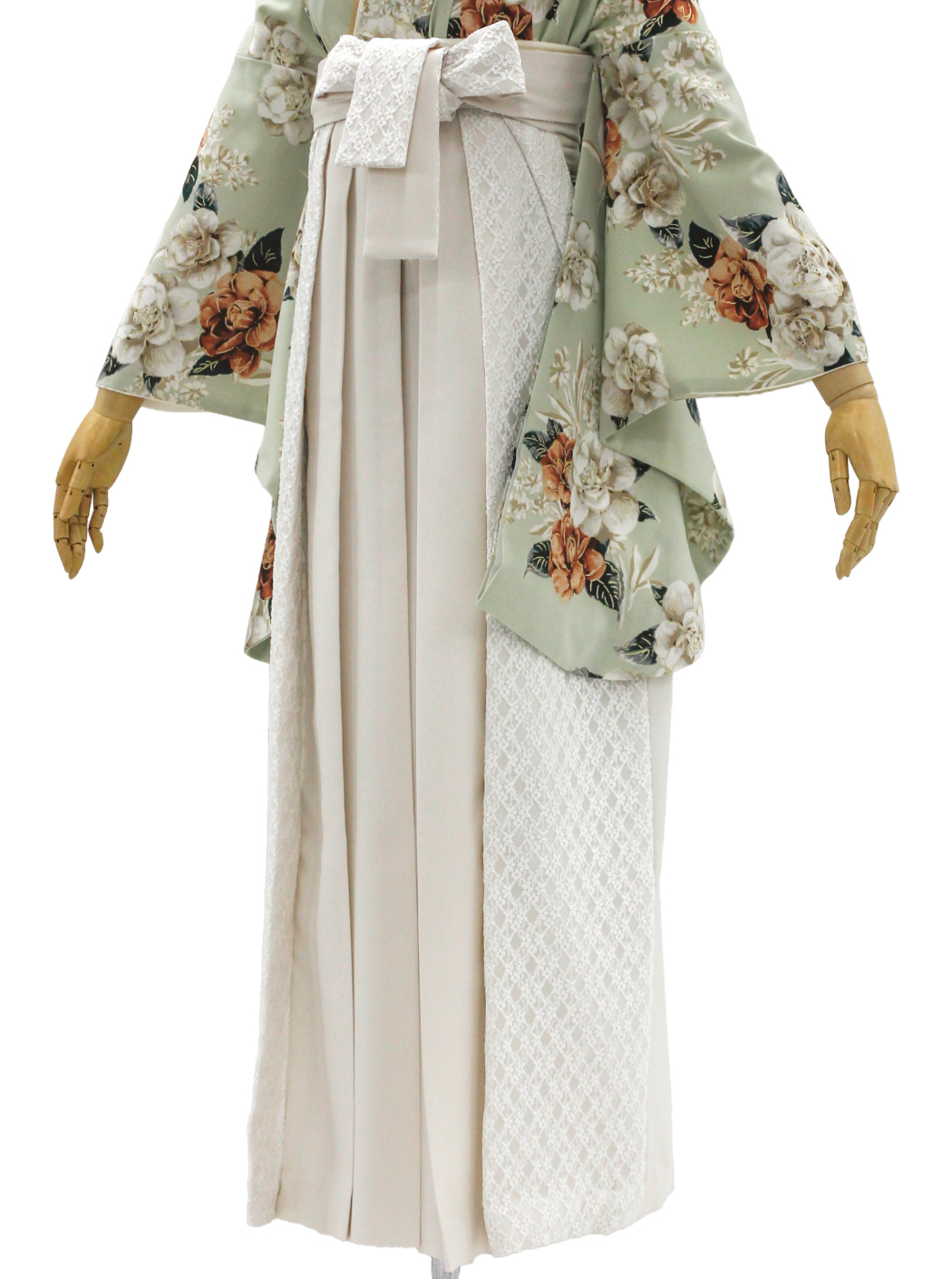 袴はオフホワイトの地色にレースの切り替えが施されています。