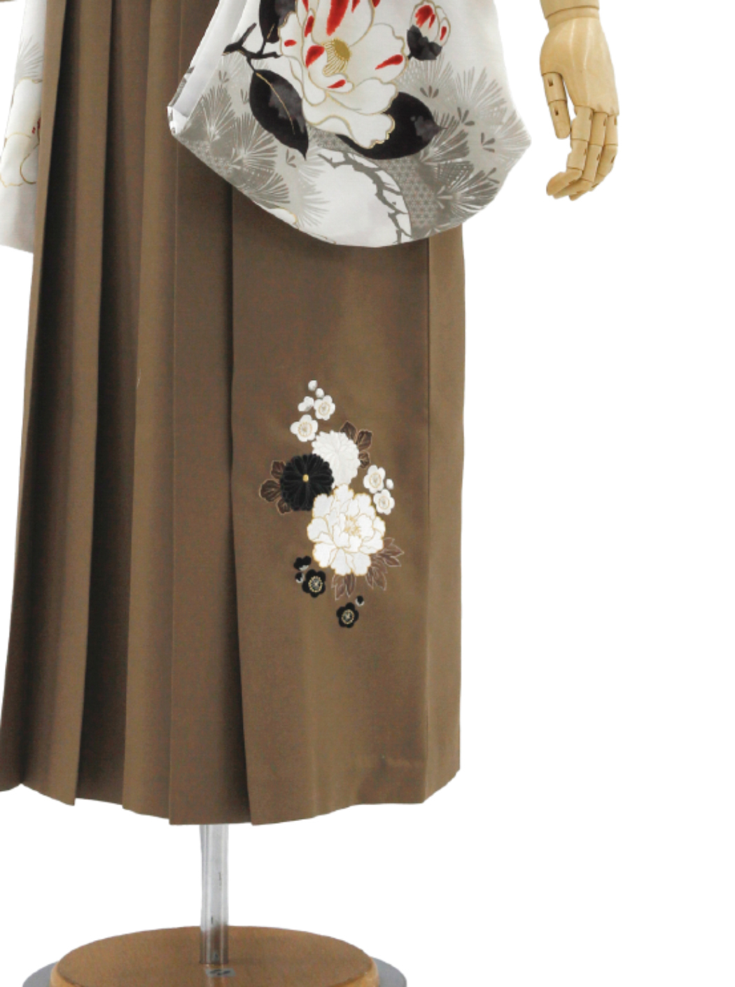 袴はベージュの地色に牡丹、菊、梅の刺繍が施されています。