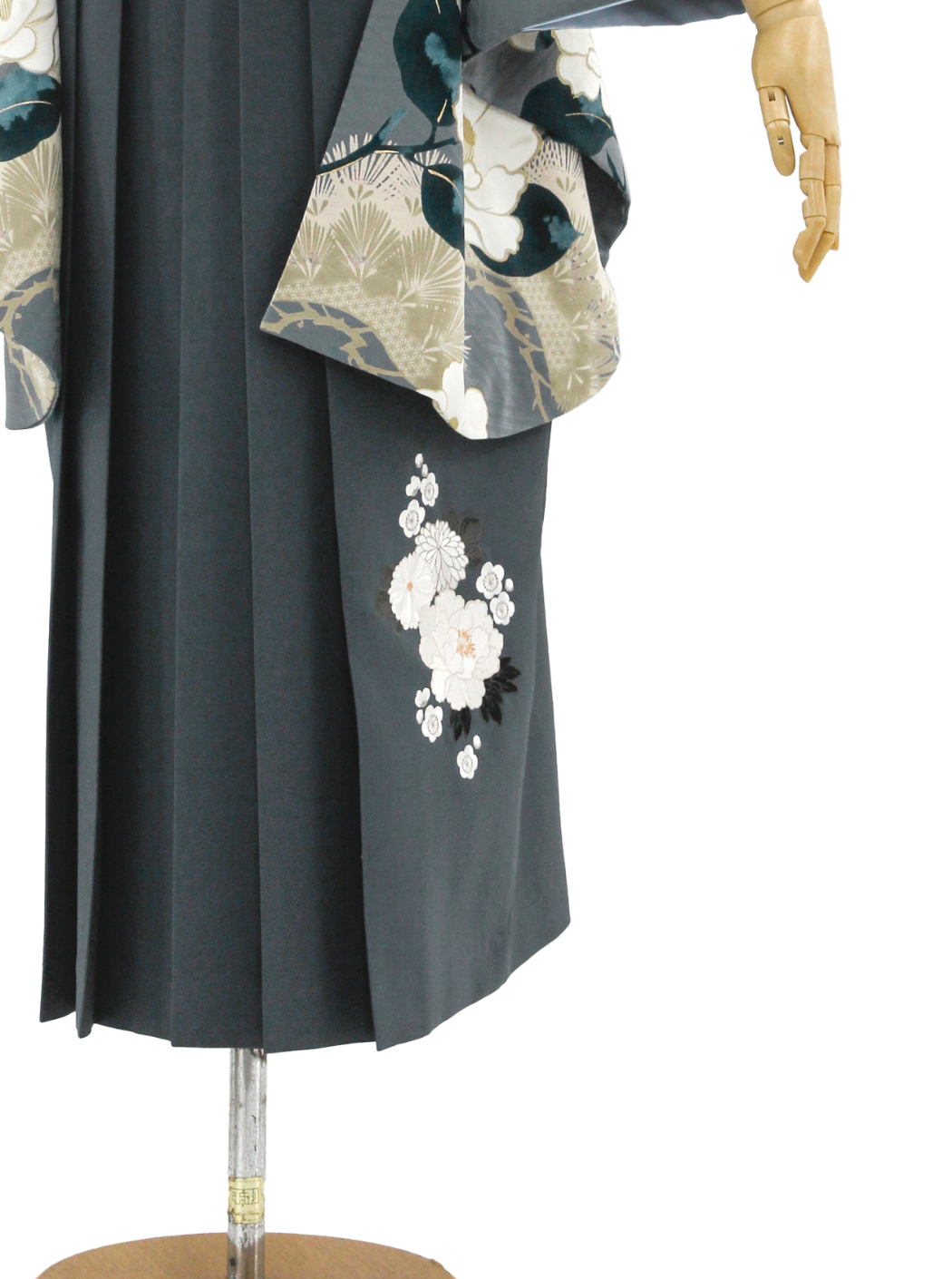 袴はグレーの地色に牡丹、菊、梅の刺繍が施されています。