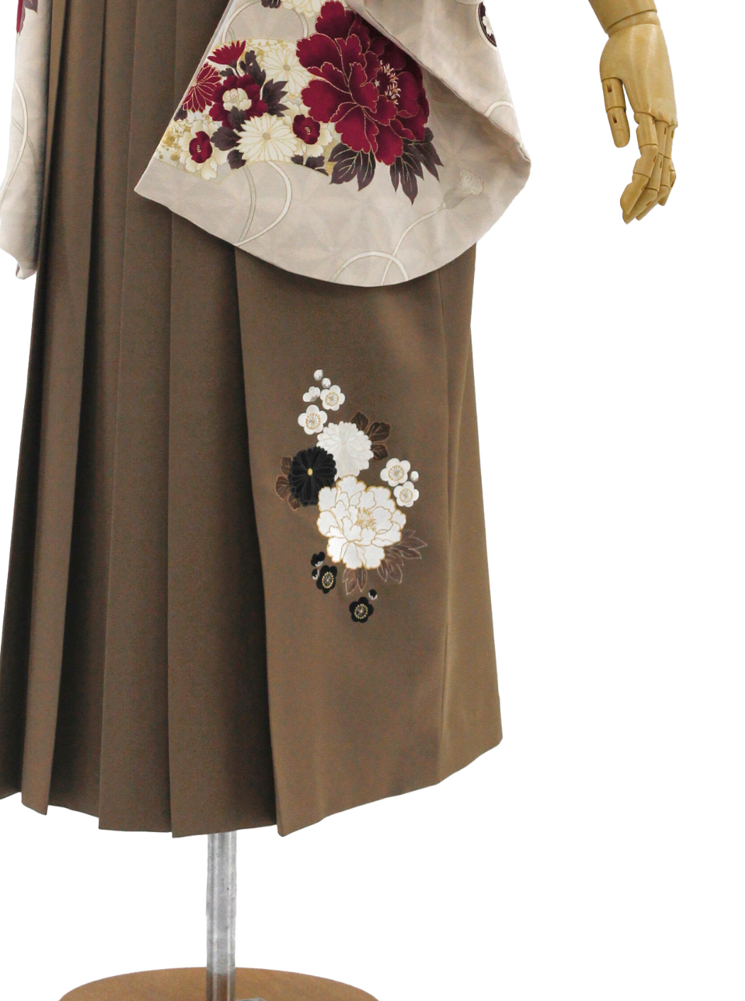 袴はベージュの地色に牡丹、菊、梅の刺繍が施されています。