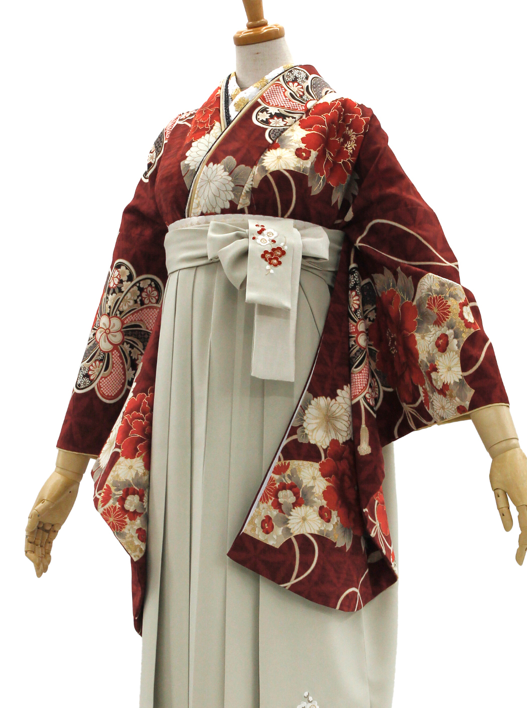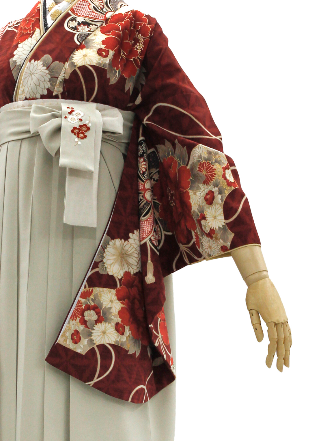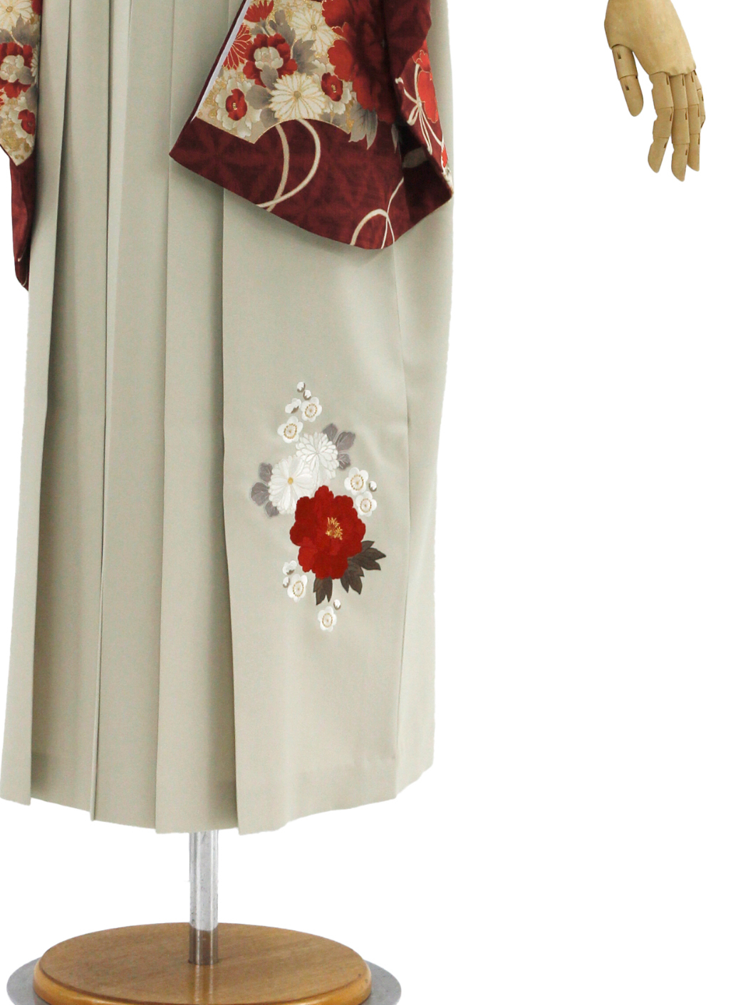 袴はアイボリーの地色に牡丹、菊、梅の刺繍が施されています。