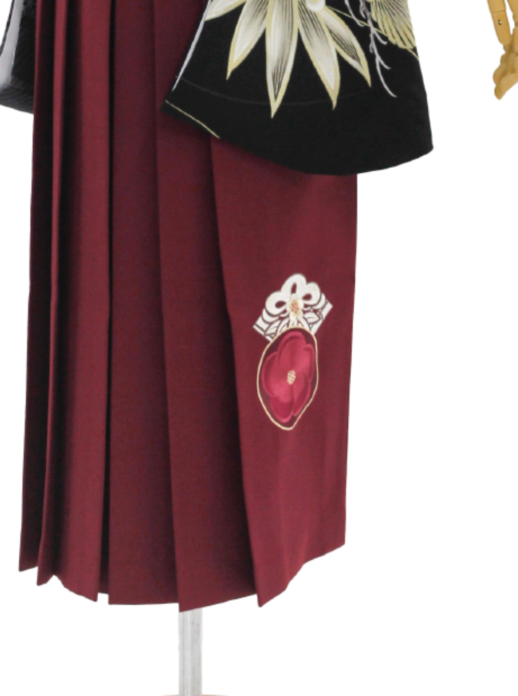 袴はエンジの地色に梅丸紋の刺繍が施されています。